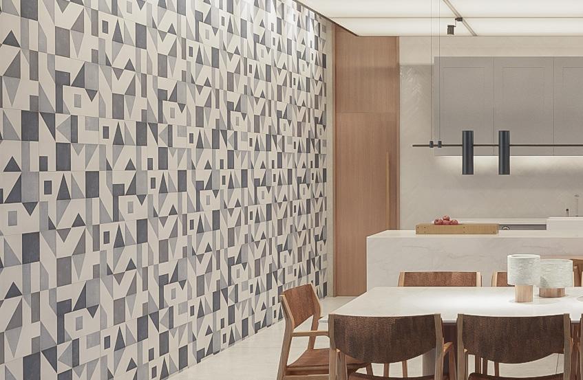 Como exemplo tem-se uma sala de jantar con jugada com a de tv, a qual o foco principal foi o painel preto com diagramação em chevron e o contraste constante com a madeira clara do buffet e o branco do hack.