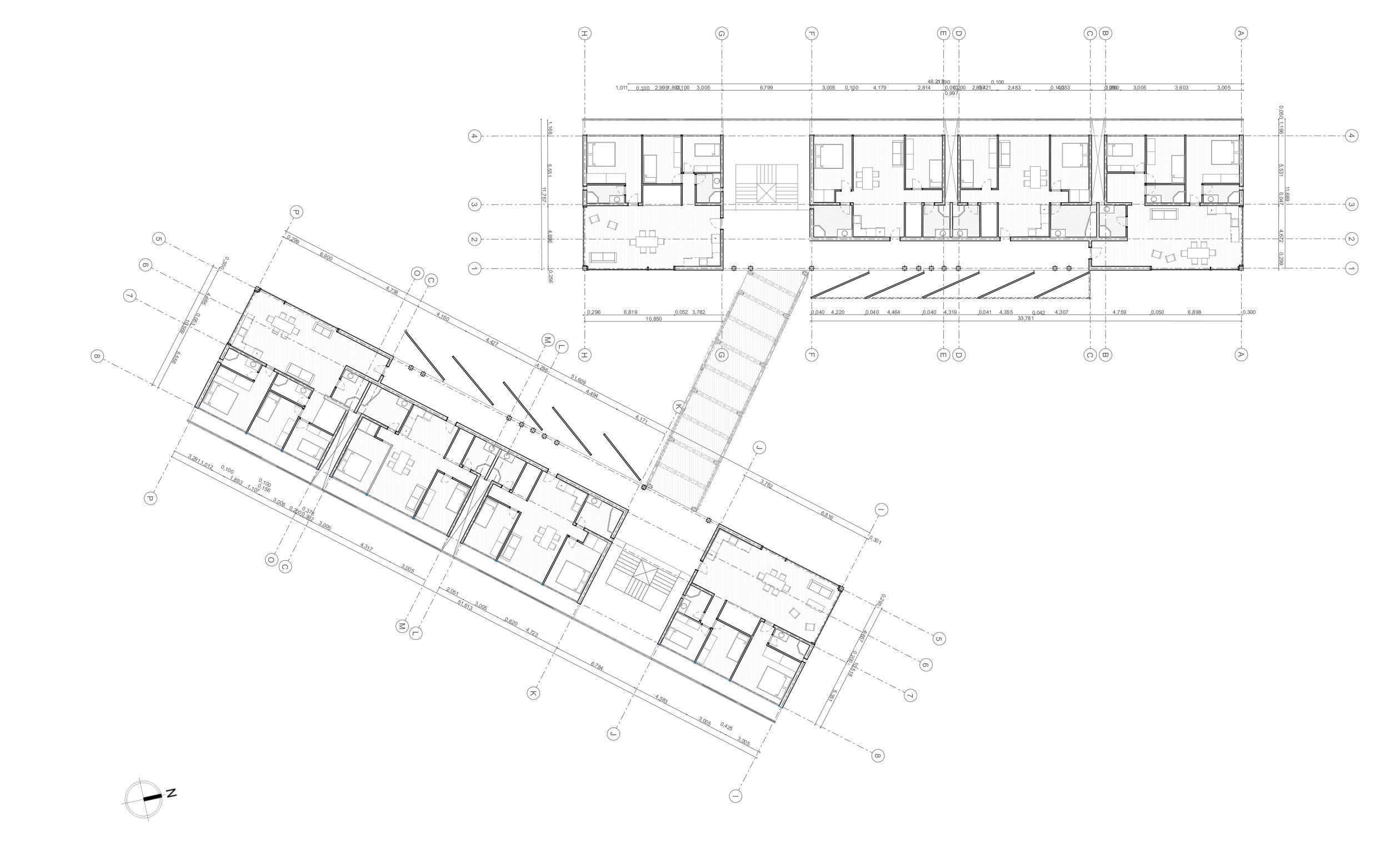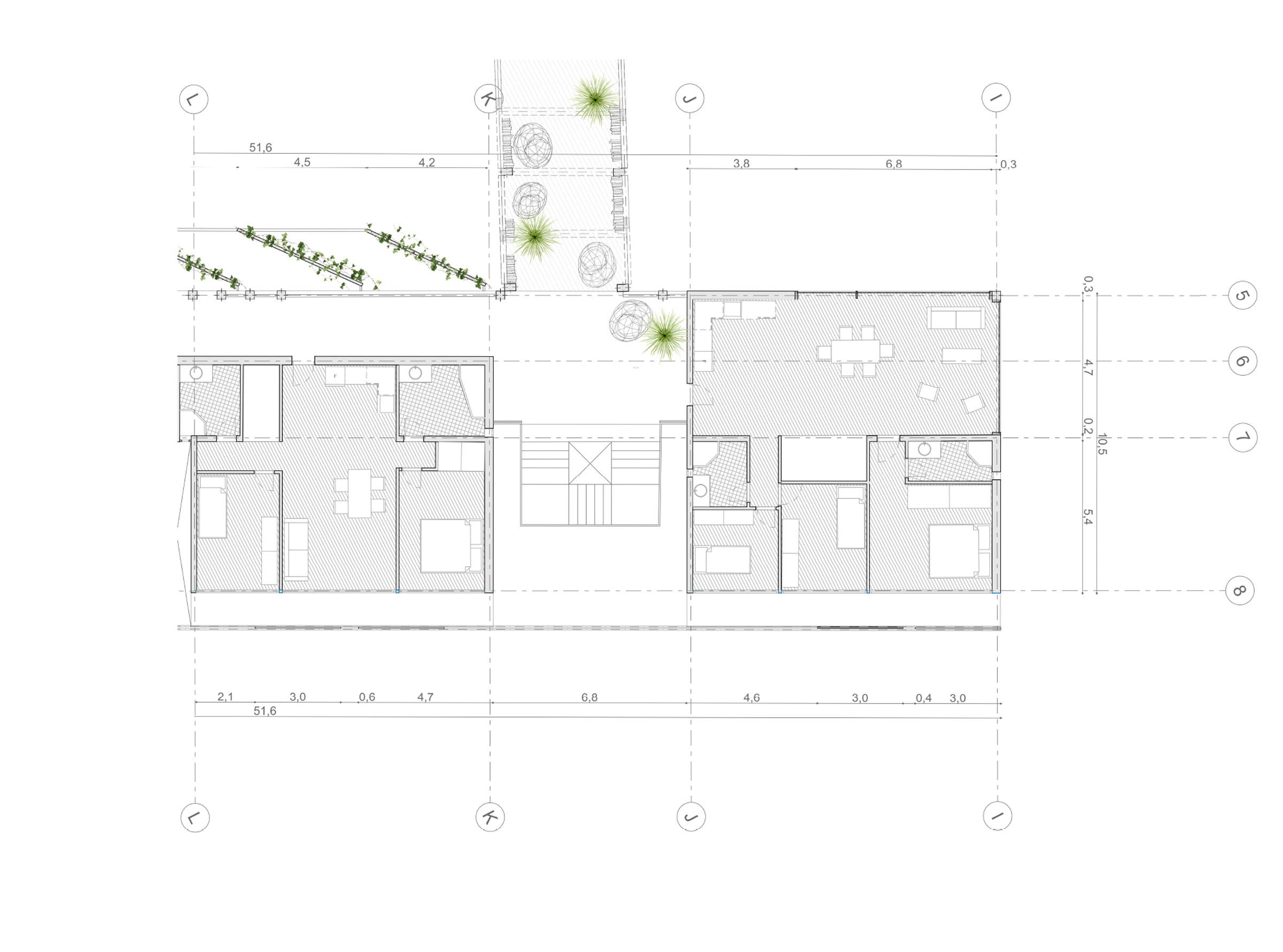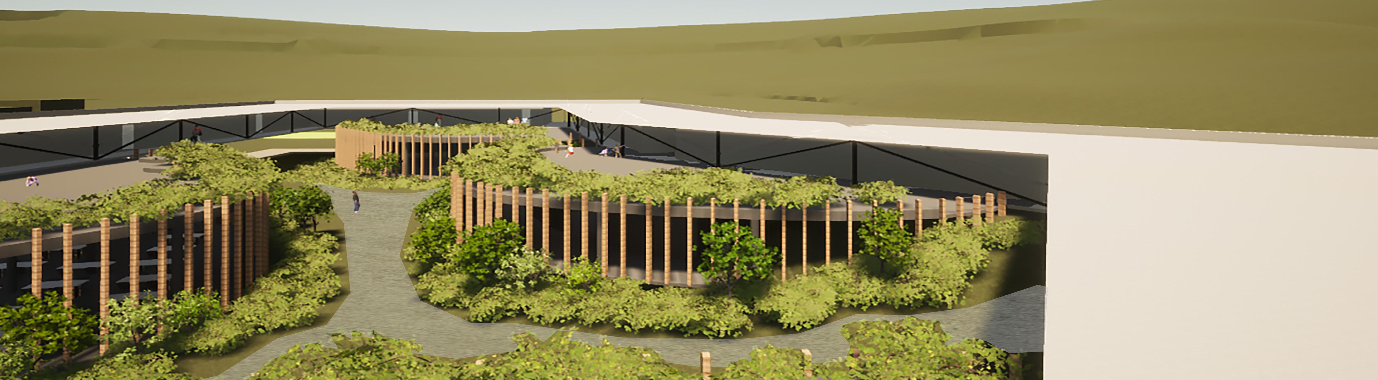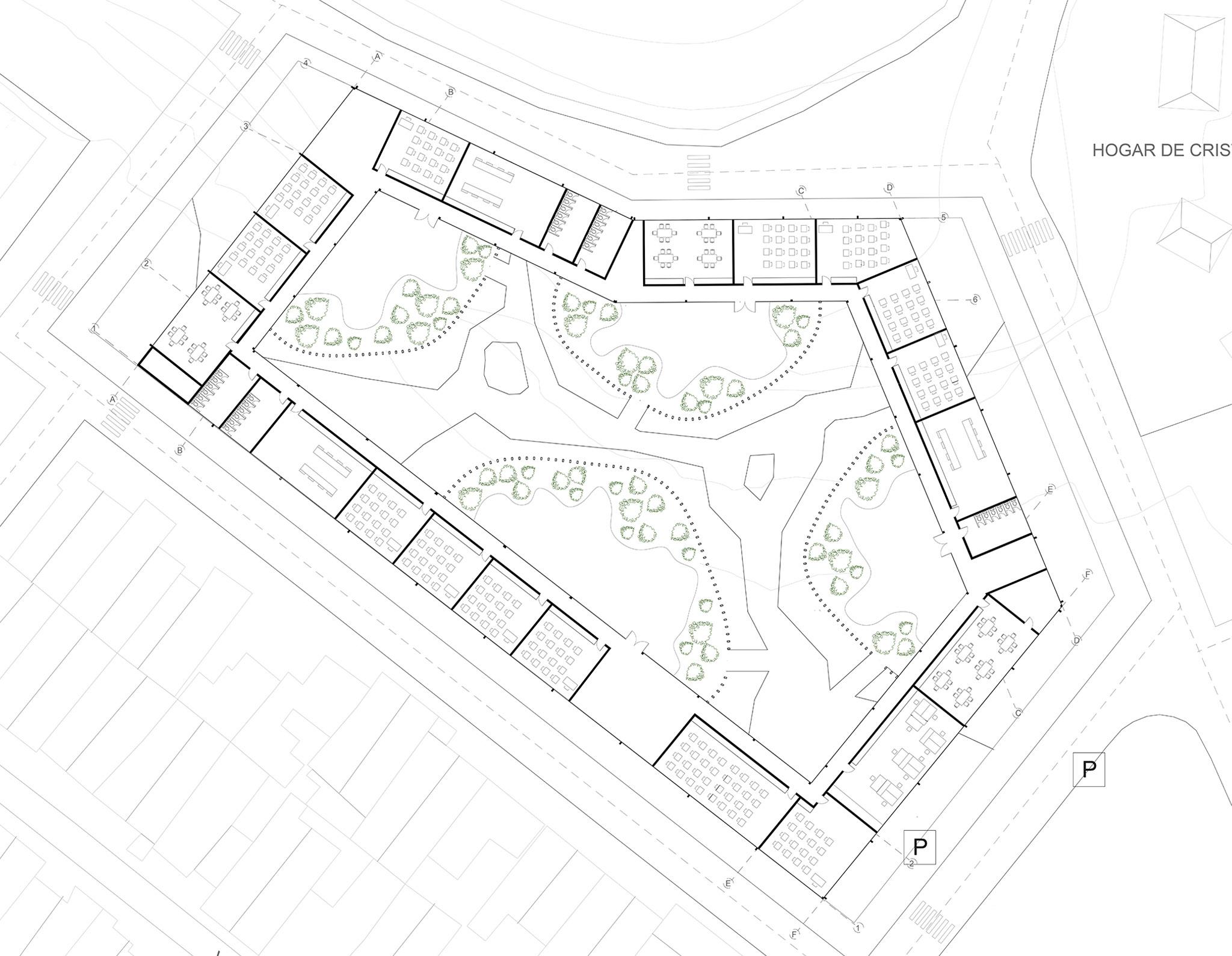 Desarrollo de proyecto para albergar migrantes. Conjunto habitacional semi-público permite llegada al centro de la manzana, espacio desaprovechado convertido en parque público. Se utilizó la desnivelación para poder separar lo público de lo semi-público.