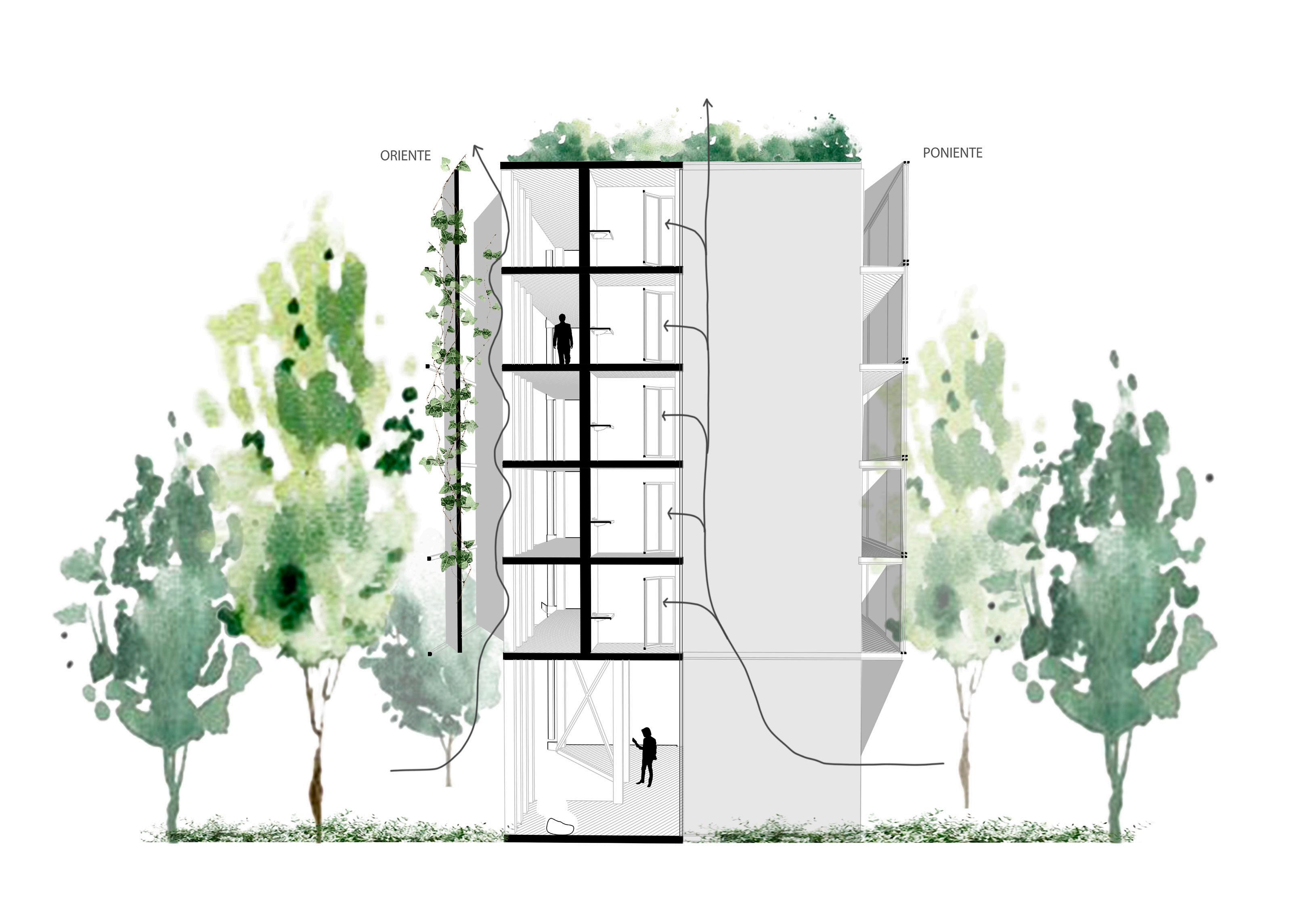 La sustentabilidad del proyecto es su esencia, vegetación, fachadas y ventilación permiten evitar contacto directo de las viviendas con el espacio público. Se trabaja principalmente la intervención menos brusca posible sobre el terreno.