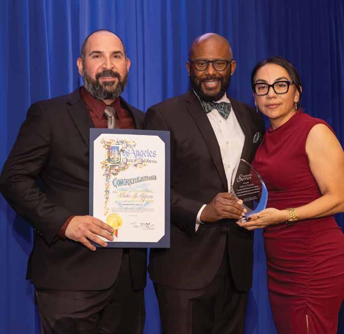 John Bagakis, Fund Development at Toberman, Assemblymember Mike Gipson, and Dr. Lupe Rivera, CEO at Toberman as a Dedicated Service award is presented to the honoree
