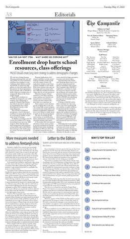 across schools, but larger preventive measures must also be taken. Superintendent Don Austin said redrawing district lines is not an option being discussed, but with an impending crisis at hand, The Campanile urges PAUSD to implement a committee to study the long-term impacts of declining enrollment and consider other potential solutions, such as allowing students from other districts to enroll in PAUSD and subsidizing housing costs for families with young students. In doing so, PAUSD will be able to maintain low class sizes, retain a top-notch teaching staff and continue to enable excellence in education for all its students. Although The Campanile recognizes the enrollment problem is partly due to broader demographic and economic changes out of the district’s control, PAUSD is still responsible for guaranteeing the best educational experience for its students. Ultimately, that means making the issue of declining enrollment a priority action item and taking active, preventive measures to safeguard the quality of a PAUSD education for decades to come.