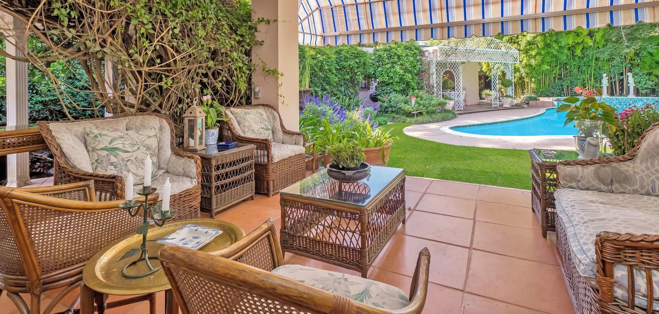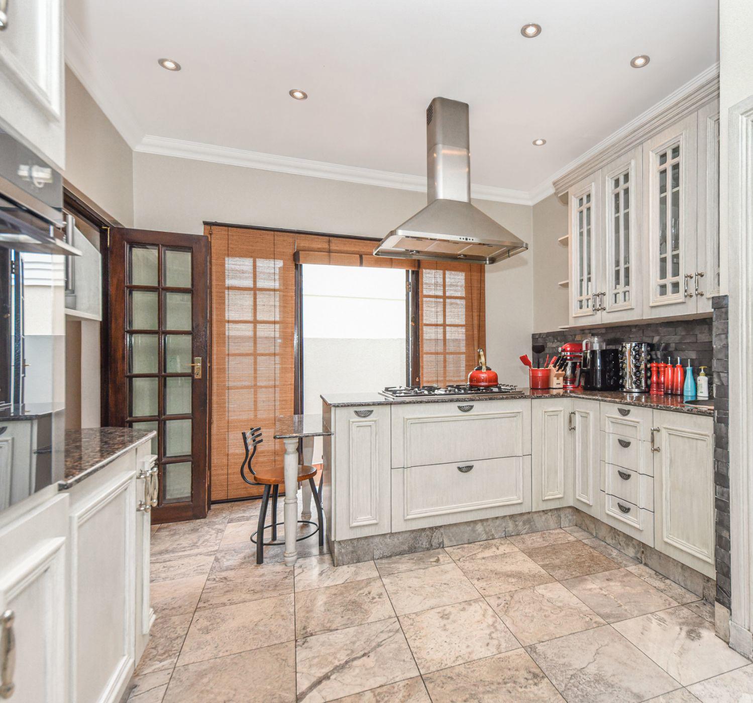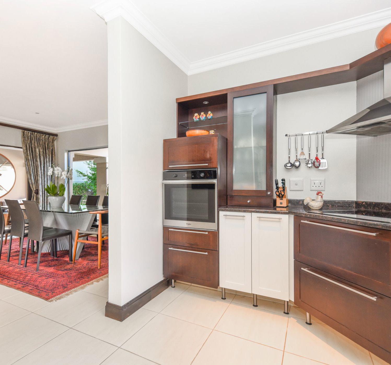 Classic and elegant cluster designed for a relaxed lifestyle, looking for a growing family. Entrance hall with an amazing granite staircase filled with sunshine from the skylight above, a Formal lounge with doors out to the garden, and a Gas fireplace. Sunny family room with fitted bar area, gas fireplace, doors out to patios, pool, and manicured garden. Open-plan fully fitted kitchen with breakfast bar leads to the dining area, Sep. scullery, Study/guest bedroom and Guest toilet.
