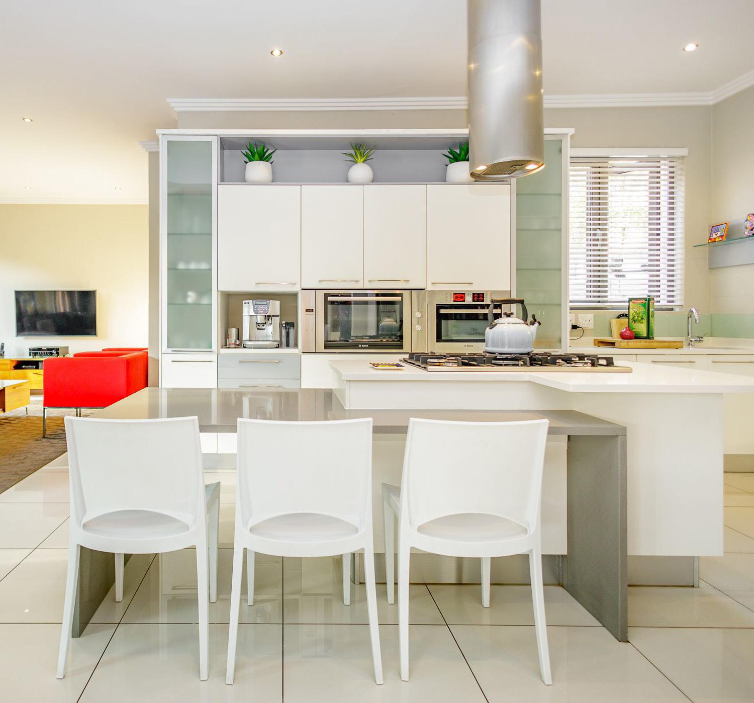 This stylish home offers superb accommodation for the discerning tenant. A wide open and welcoming double-volume entrance hall leads to light and airy living areas. The Shuco aluminum concertina doors offer a seamless flow between the lounge and bar area onto the patio and pool, creating a serene and comfortable zone. The gourmet kitchen with center isle and sublime finishes features Caesar stone countertops, a gas hob, an eye-level oven and a fitted microwave. A sweeping staircase leads up to the beautiful bedrooms, all with luxurious en-suite bathrooms. The elegantly finished landing leads to an open area that can be used as a pajama lounge/ study area or gym.