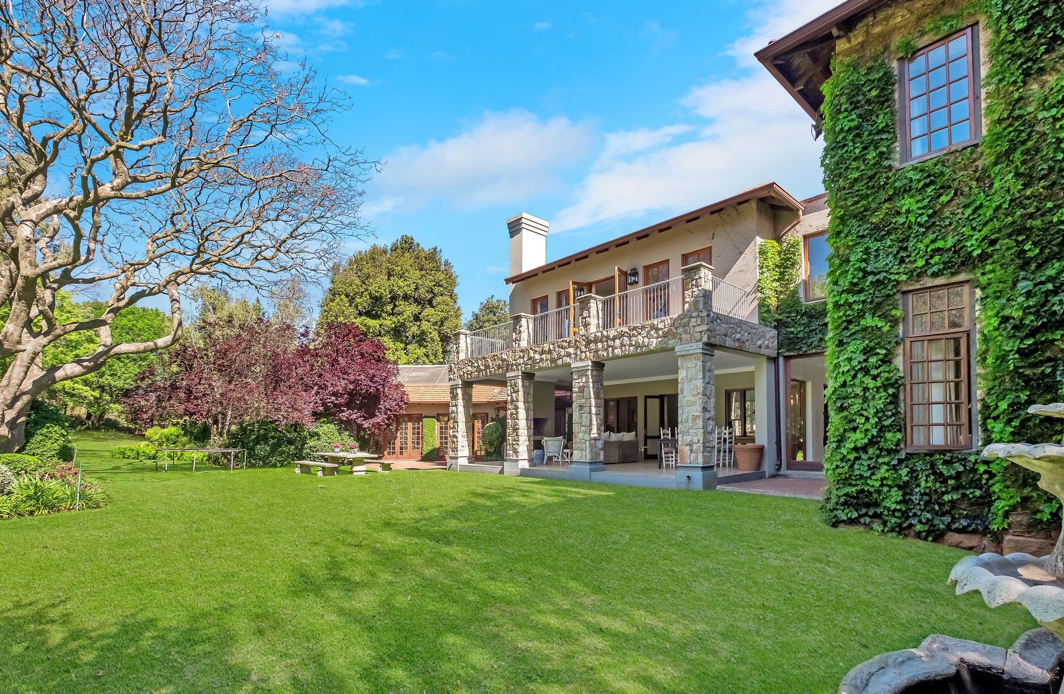 Be the first to view this exceptional family home. Each corner is a revelation. Tasteful and luxurious for a relaxed lifestyle. Surrounded by lush greenery, manicured and established gardens…. a children’s haven. Nothing has been spared. One wing has 3 e-suite carpeted bedrooms and Dressing rooms /with built-in cupboards. Fourth en-suite bedroom/teenager pad or workfrom-home, fully self-contained. Open-plan receptions flow out to the covered patio and private entertainment area. Fully fitted kitchen with breakfast area large scullery and pantry.