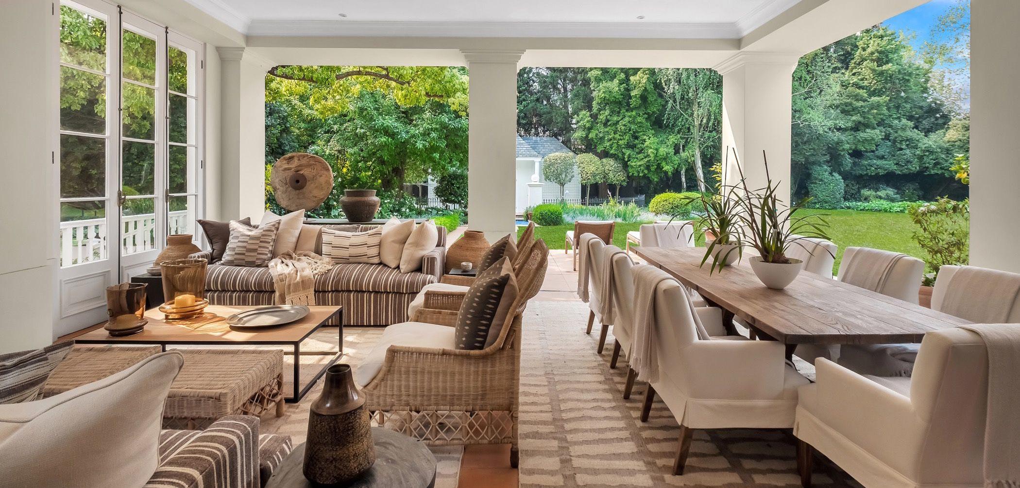 Imaginative design and impeccably decorated, offering all the fundamentals for a perfect home from comfortable family living to grand scale entertainment. Enter into a light-infused doublevolume entrance hall to a formal lounge with fireplace on the left and leading to the spectacular open plan living area and all–weather, indoor-outdoor patio, and wood-burning indoor Braai all overlooking a serenely private Zen garden with fountain feature solar heated, salt chlorinated pool, a separate seated fire pit areas, and pergola dining space.