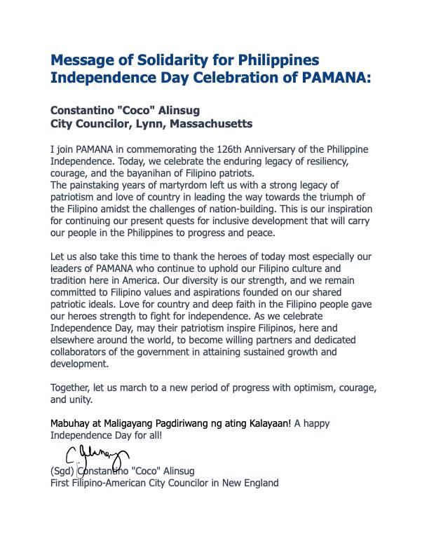 The Embassy of the Republic of the Philippines in Washington, D.C. joins the Philippine American Mainstream Advocacy for Non-Partisan Associations, Inc. (PAMANA) and the Filipino community in Massachusetts in celebrating the 126th Anniversary of the Proclamation of the Philippine Independence.