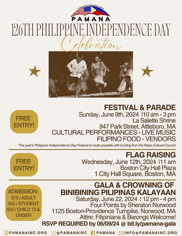 Celebration 126THPHILIPPINEINDEPENDENCEDAY PAMANAINC.ORG @PAMANAINC PAMANA INFO@PAMANAINC.ORG FESTIVAL&PARADE Sunday,June9th,2024 |10am-3pm LaSaletteShrine 947ParkStreet,Attleboro,MA CULTURALPERFORMANCES-LIVEMUSIC FILIPINOFOOD-VENDORS GALA&CROWNINGOF BINIBININGPILIPINASKALAYAAN Saturday,June22,2024 |12pm-4pm FourPointsbySheratonNorwood 1125Boston-ProvidenceTurnpike,Norwood,MA Attire:Filipiniana&BarongsWelcome! RSVPREQUIREDby06/09/24@bit.ly/pamana-gala ADMISSION: $75/ADULT $65/STUDENT $25/CHILD12& UNDER FREE ENTRY! Thisyear'sPhilippineIndependenceDayFestivalismadepossiblewithfundingfromtheMassCulturalCouncil FLAGRAISING Wednesday,June12th,2024 |11am BostonCityHallPlaza 1CityHallSquare,Boston,MA FREE ENTRY!