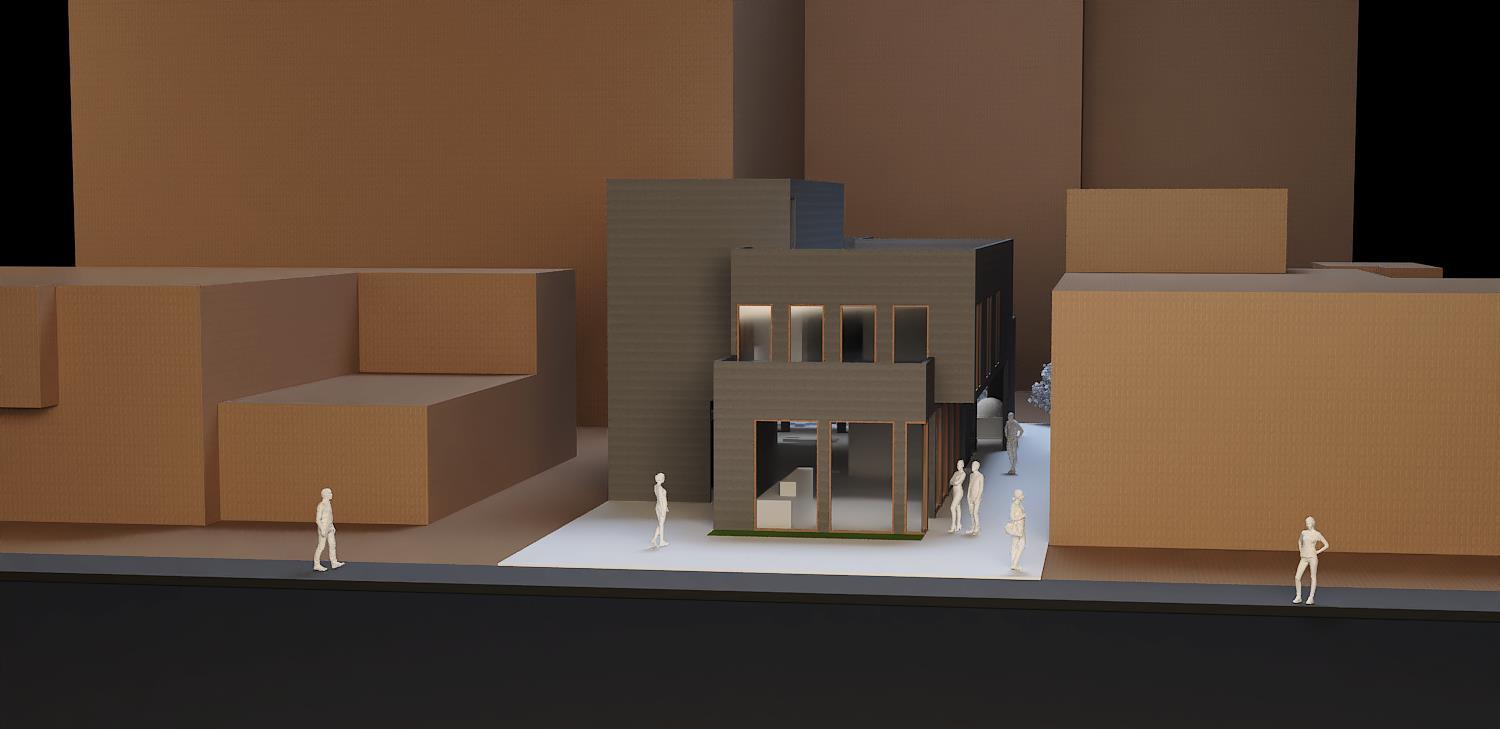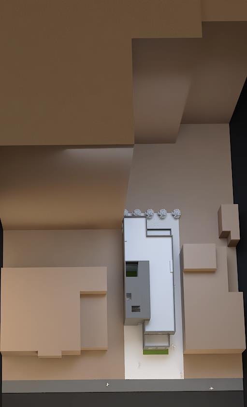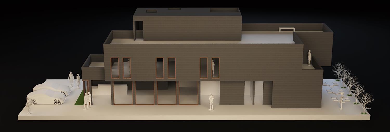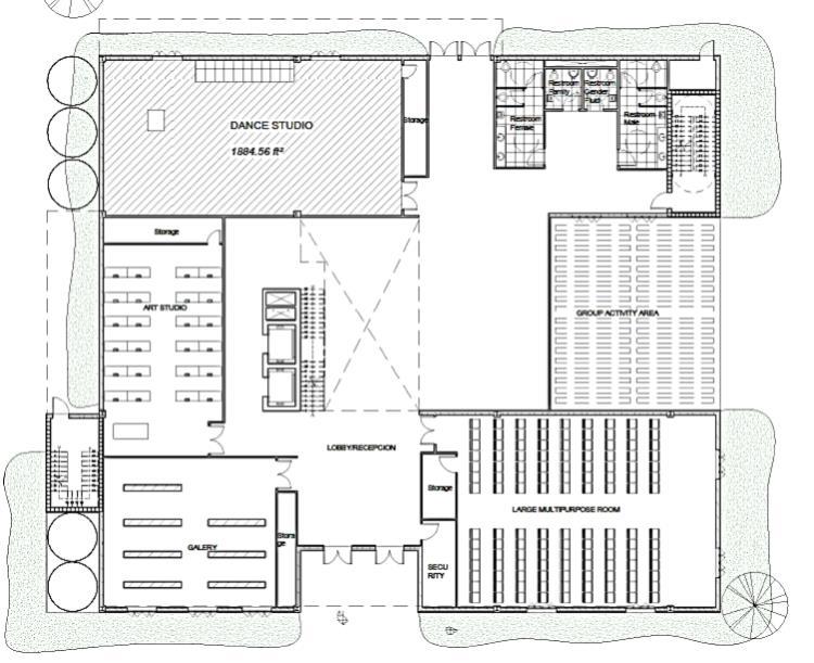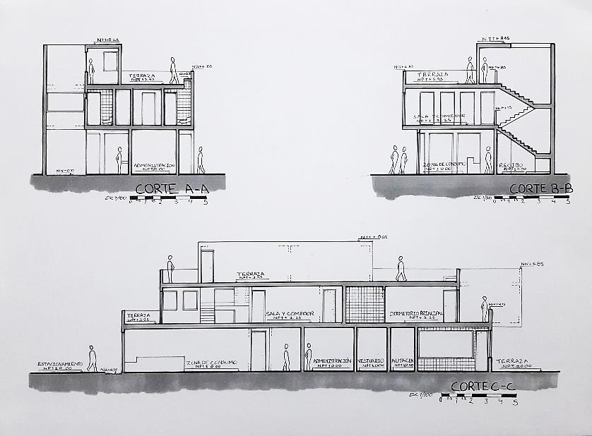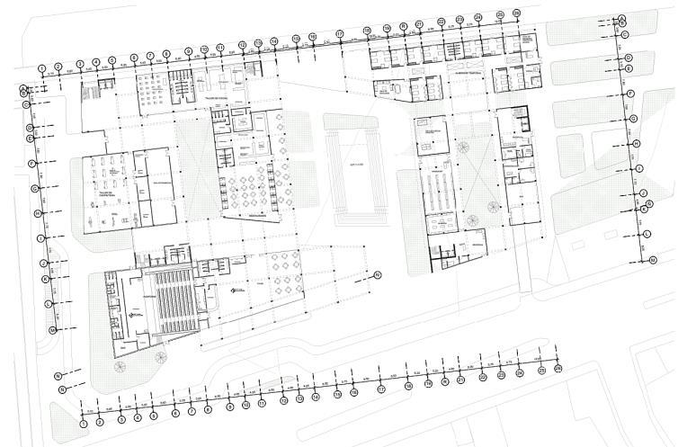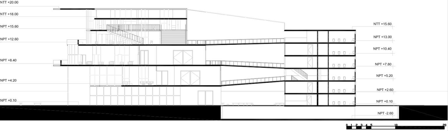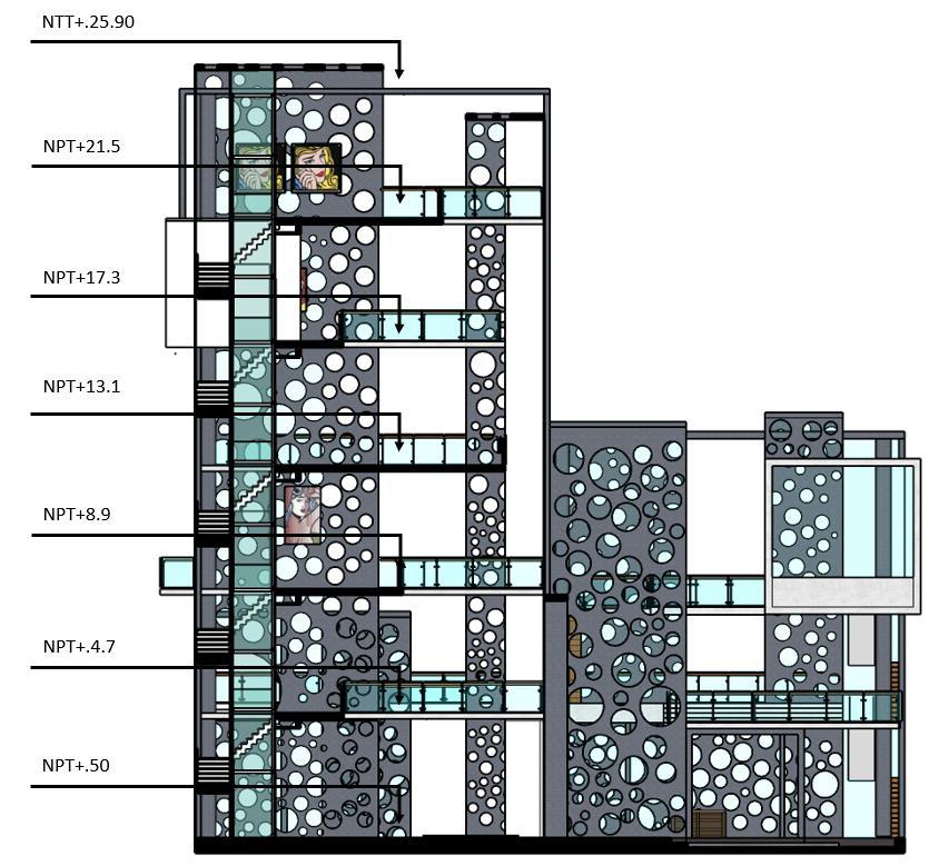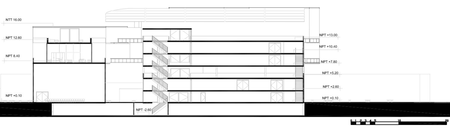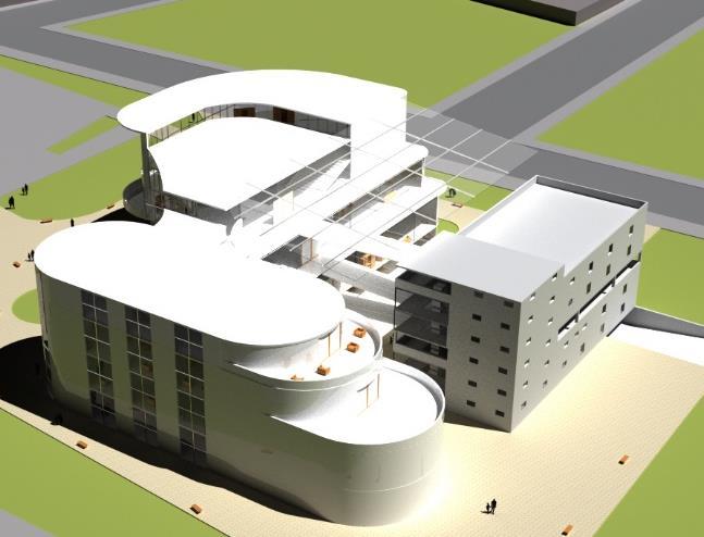 El proyecto consisti en un centro cultural (3 pisos) y en una residencia (4 pisos) con un concepto de conectividad ediante flujos que buscaban relacionarse ediante un anfiteatro central.