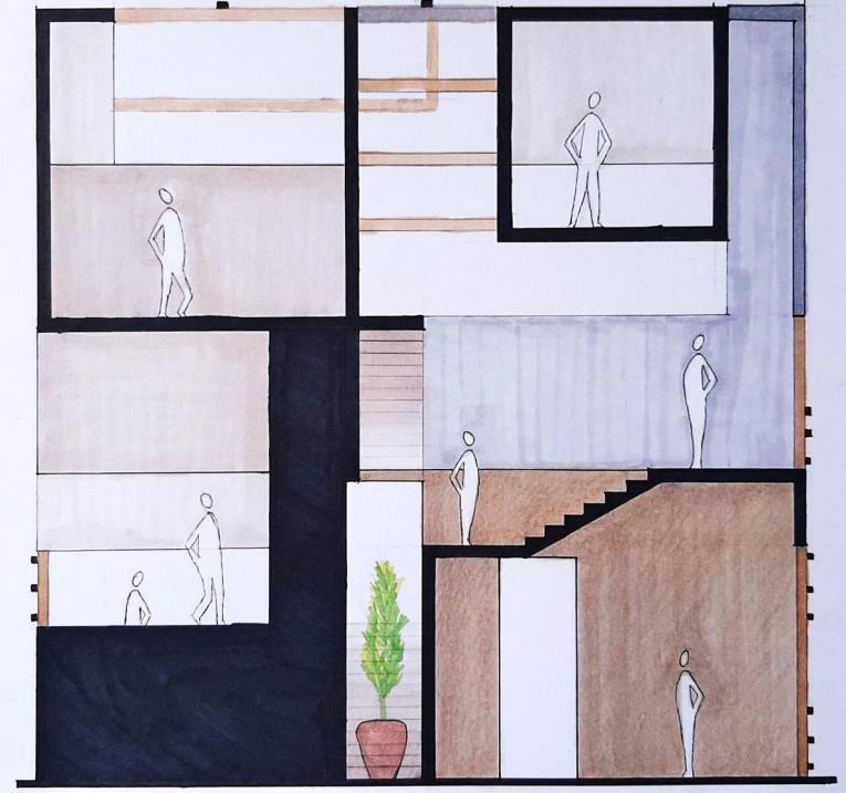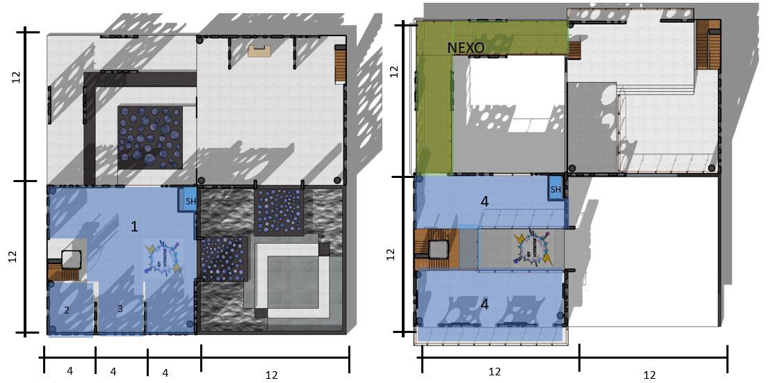 En este proyecto se desarrollo 4 espacios tectnicos y 3 espacios estereoticos relacionados entre si con un espacio jerarquizado y todos ubicados a distinto nivel, inscritos en un cubo virtual.