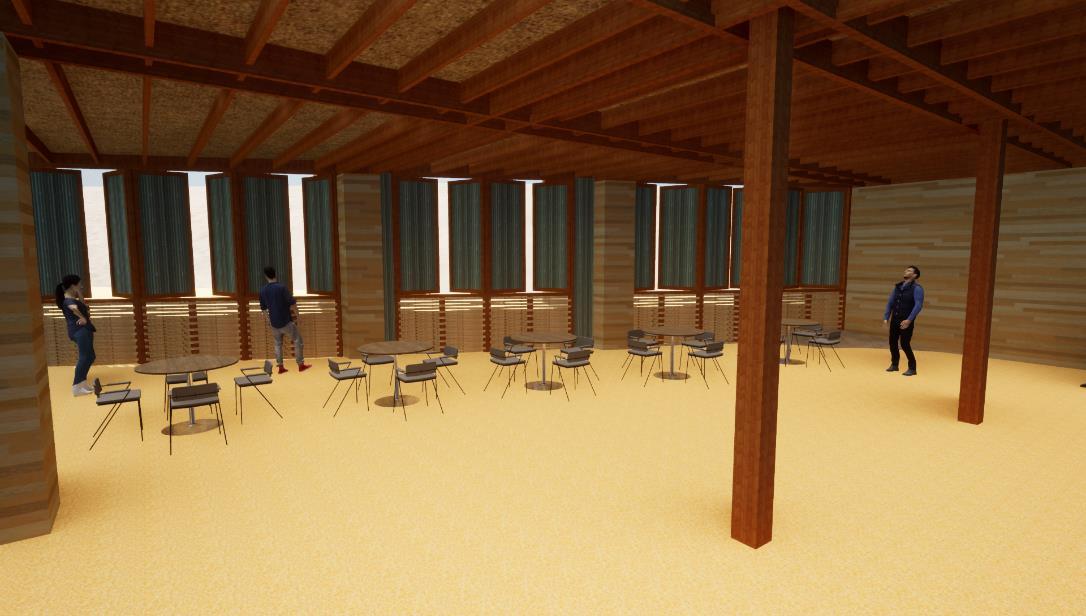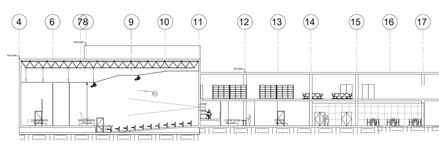 El auditorio fue diseado con capacidad de 265 personas en el edificio cultural. Este se destaca con un acabado teturizado de concreto