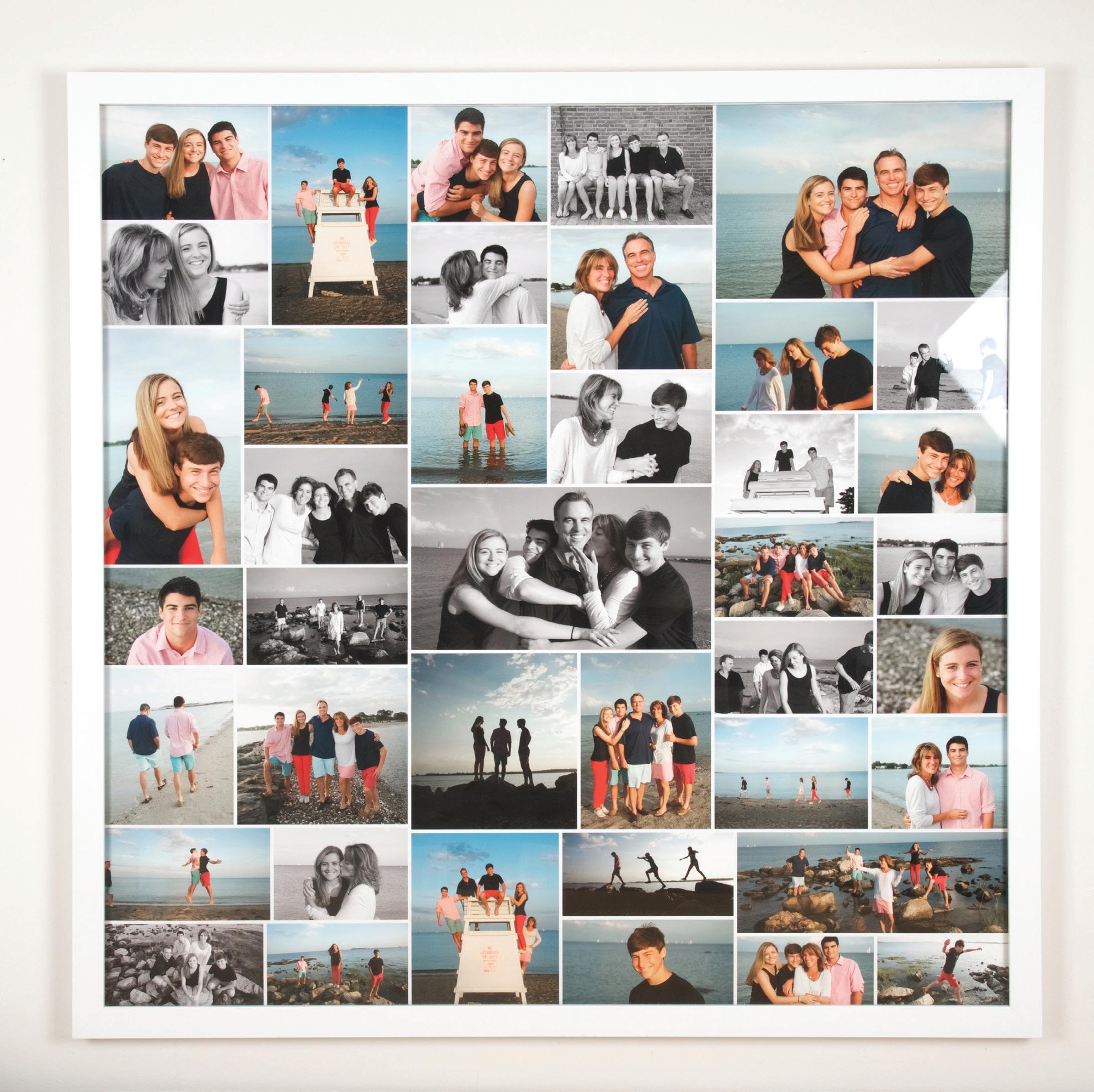Our signature presentation. A grid or mosaic of 30-45 images that capture the full story of you and your family. Contemporary museum quality floating mount behind clear acrylic glass or as a metal print. Also available as a traditional framed archival print.