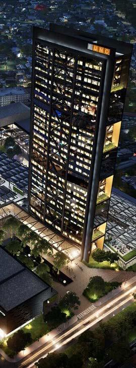 volumes, creating green terraces that serve as a plinth for the office tower. This terrace levels, offering a visually dynamic structure.