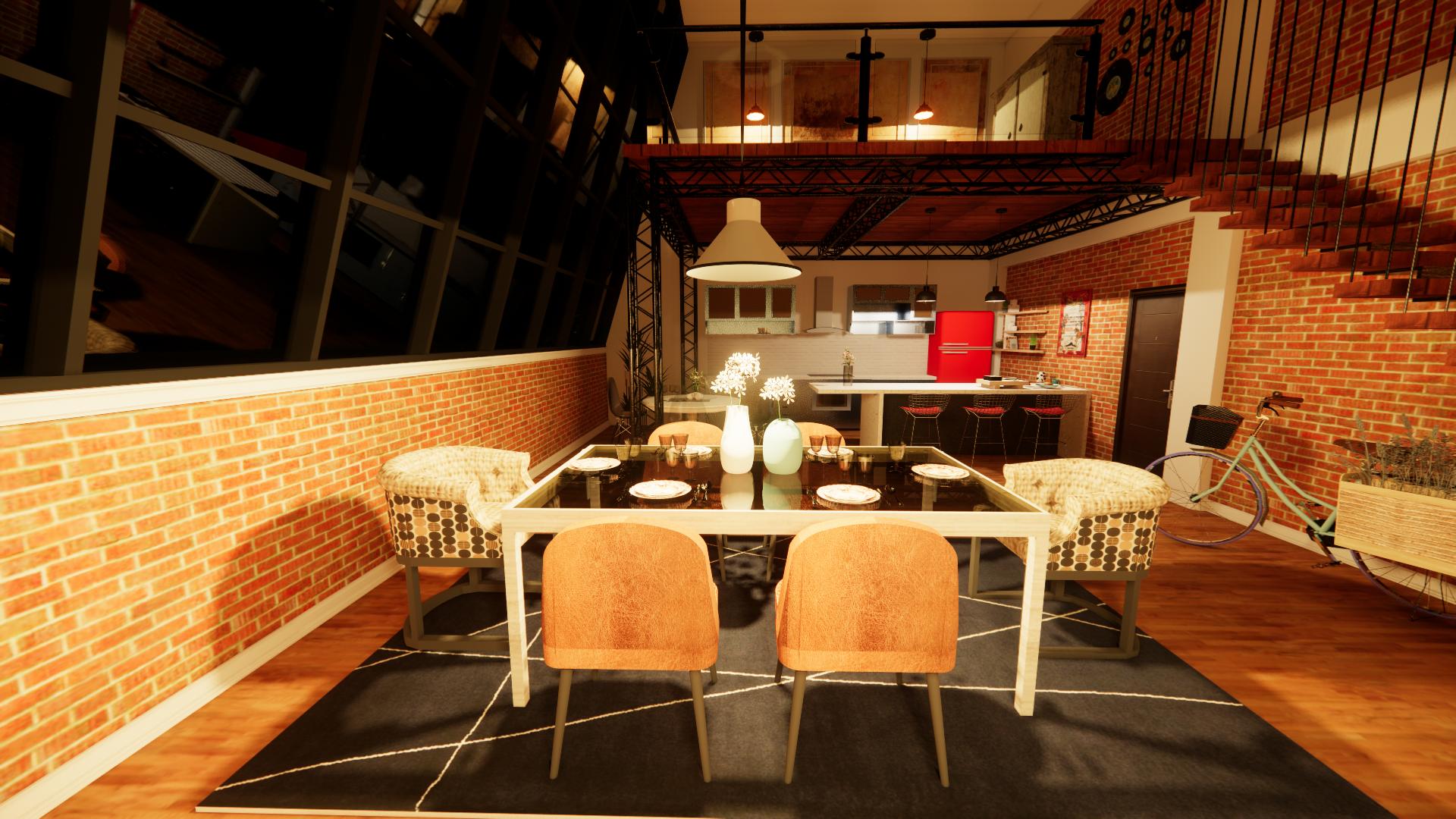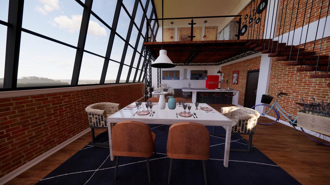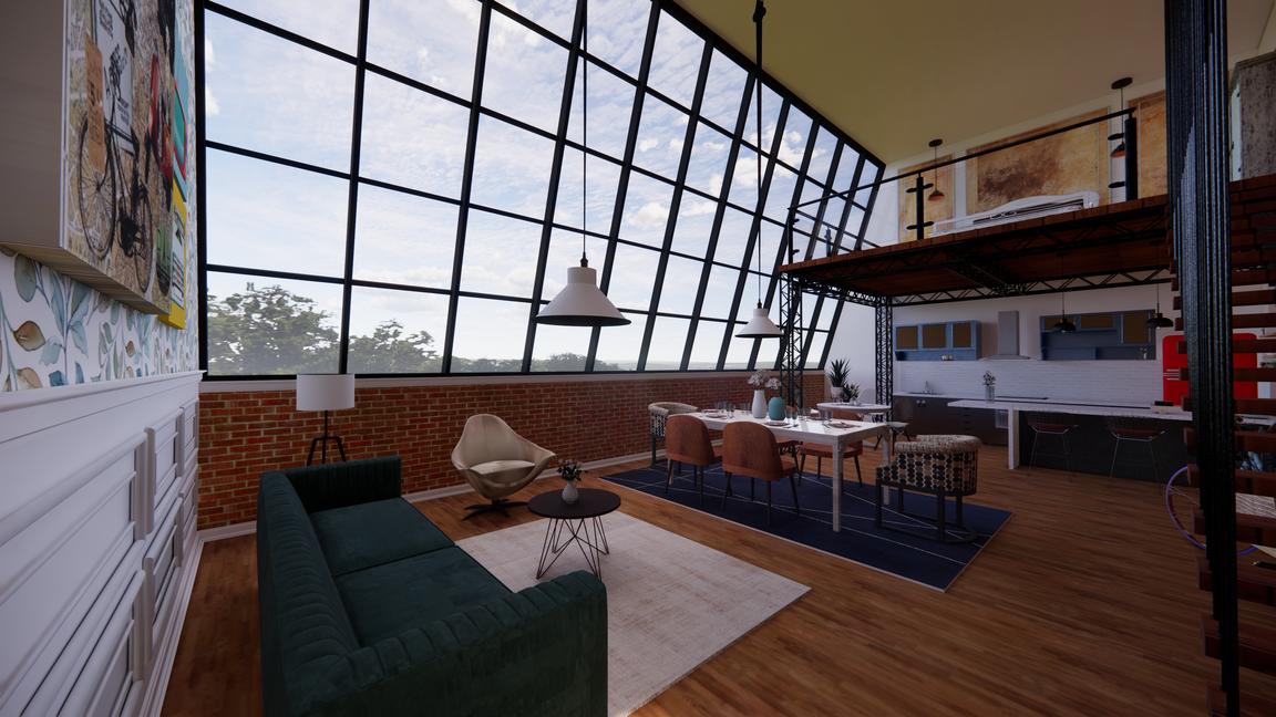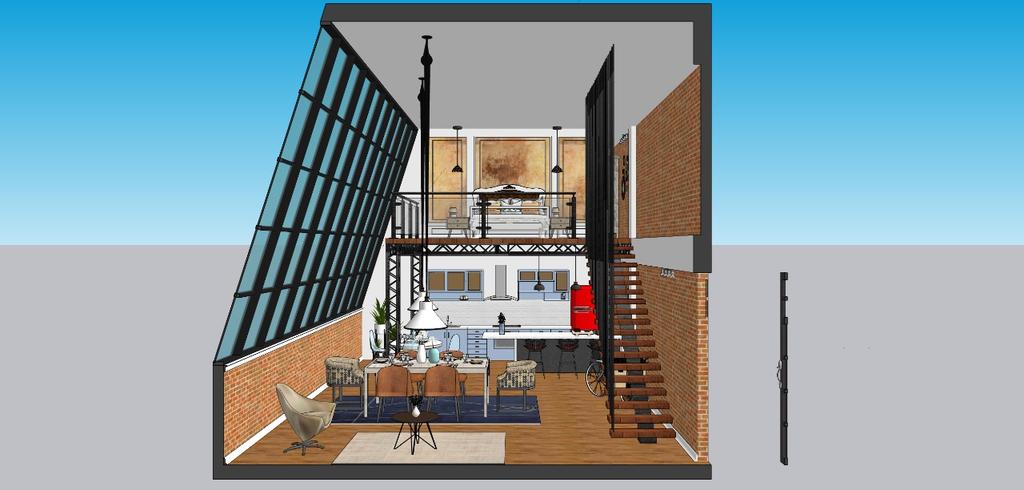 acabado en ladrillo caravista Metal Grandes ventanales Poliestireno Divisores de espacios como falsas columnas, paneles moviles y celosias Escaleras con materiales ligeros Lamparas colgantes.