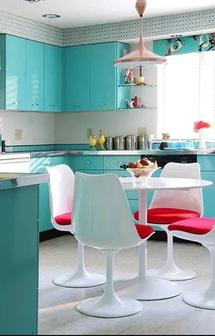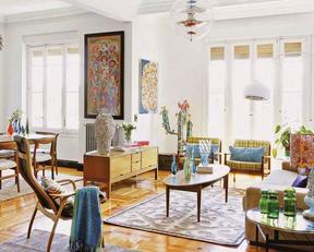 las mesas de centro ovaladas, los sillones o butacas con cojin de crochet. Los muebles y electrodomesticos son de siluetas curvilineas o rectangulares.