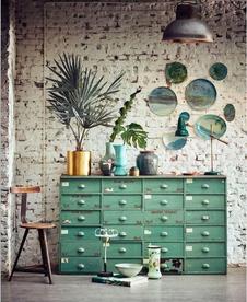 La madera clara y semi-oscura Colores como el verde, amarillo o azul combinados con el rojo y el mostaza en tonos suaves.