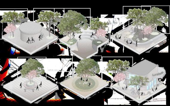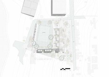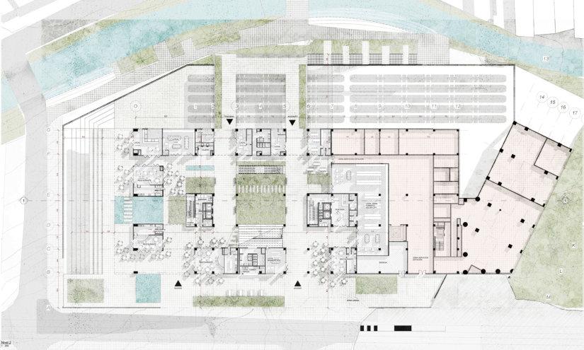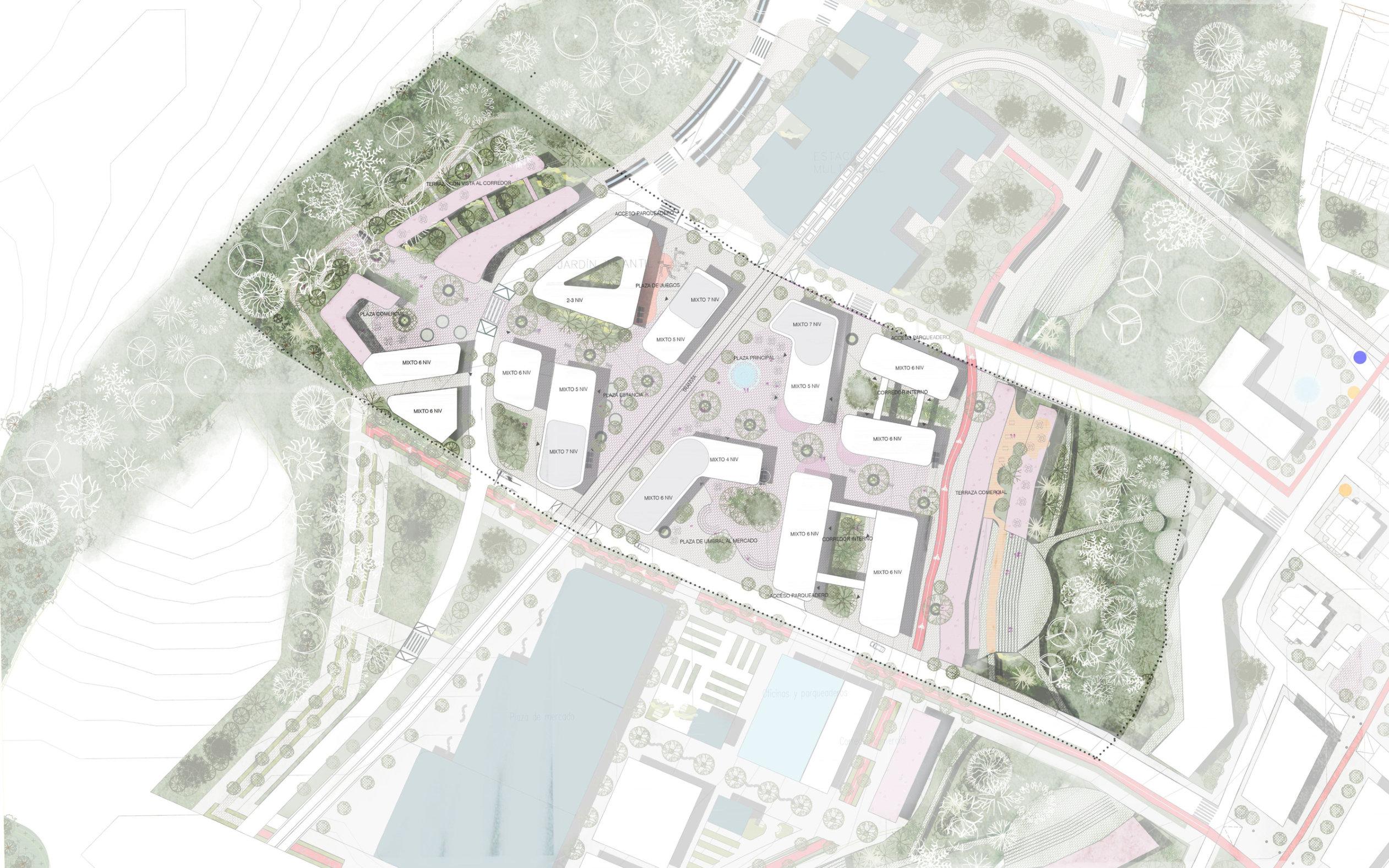 la pieza urbana se localiza frente a la plaza de mercado de la unidad de actuación y junto a la línea del tranvía proyectada. Esta pieza urbana, por su forma en L diagonal crea una plaza de espacio público que responde al programa del edificio que se plantea con un zócalo urbano con la idea de generar la calle barrial gastronómica vitalizada y activa.