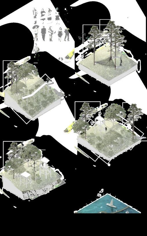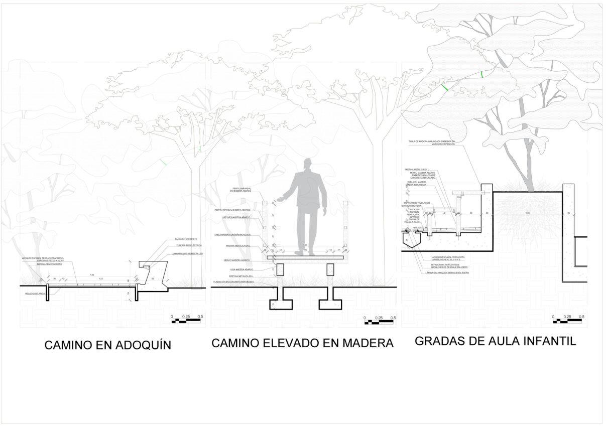 Se define que en ciertos tramos del camino, sobre todo los más án abroles como columnas para puentes elevados que a su vez permitan visuales diferentes del entorno. Se considera como materialidad la madera de roble