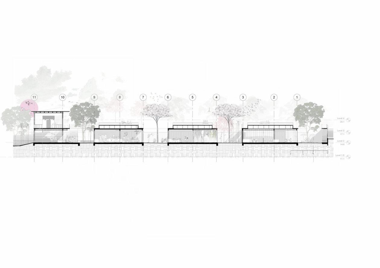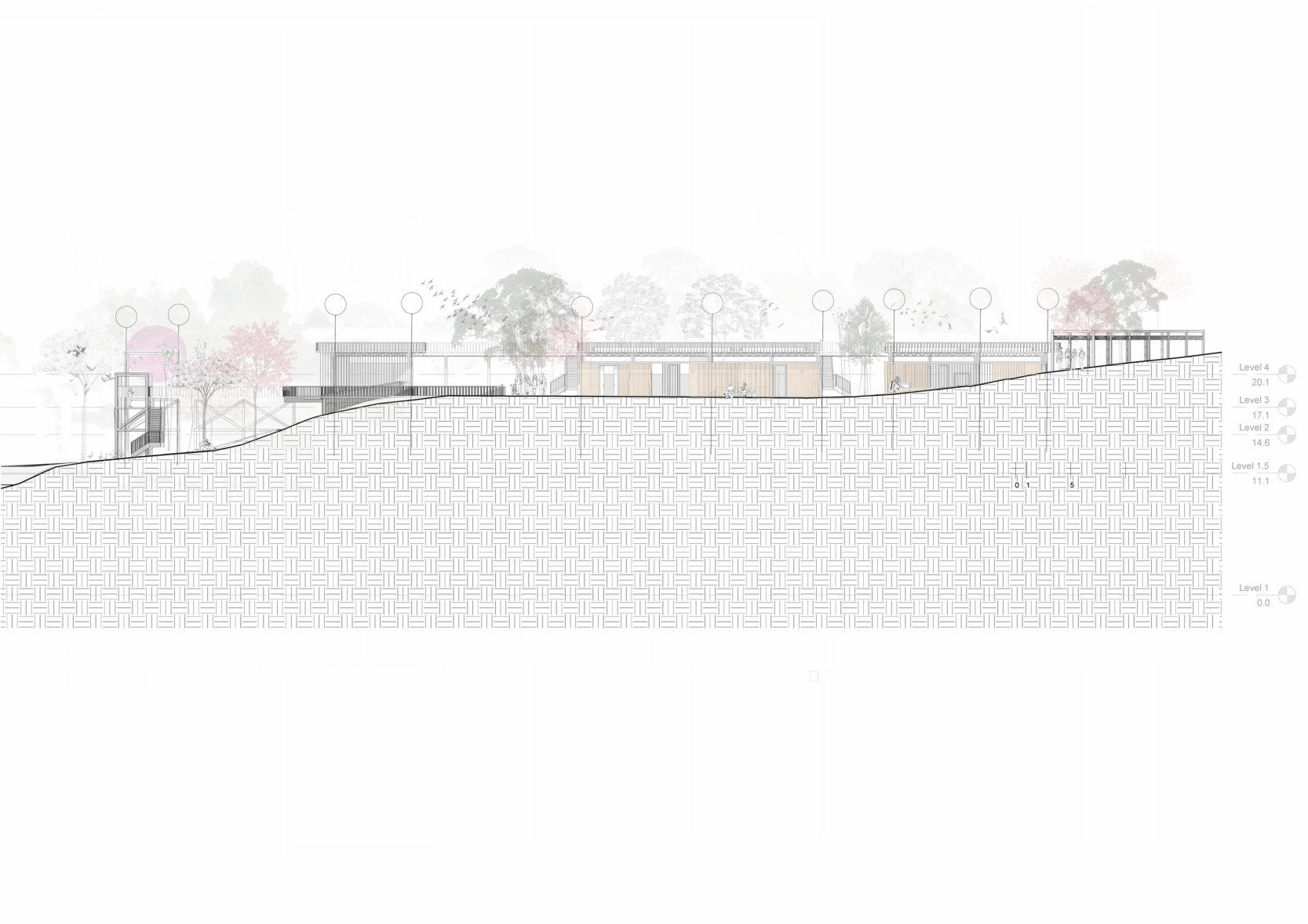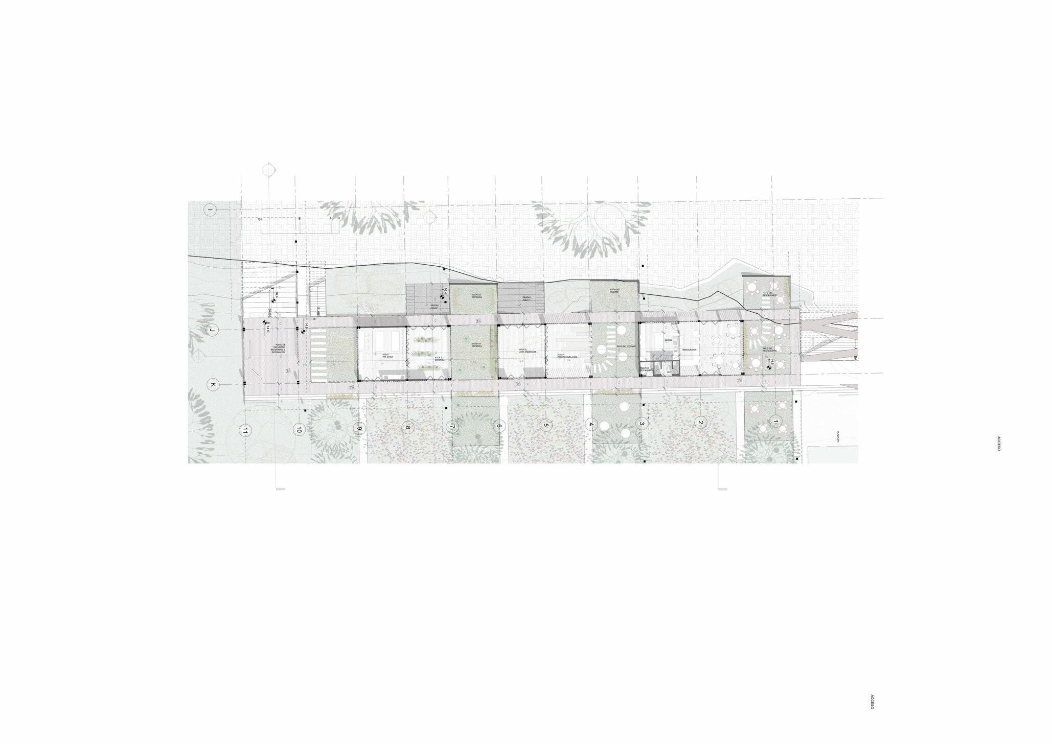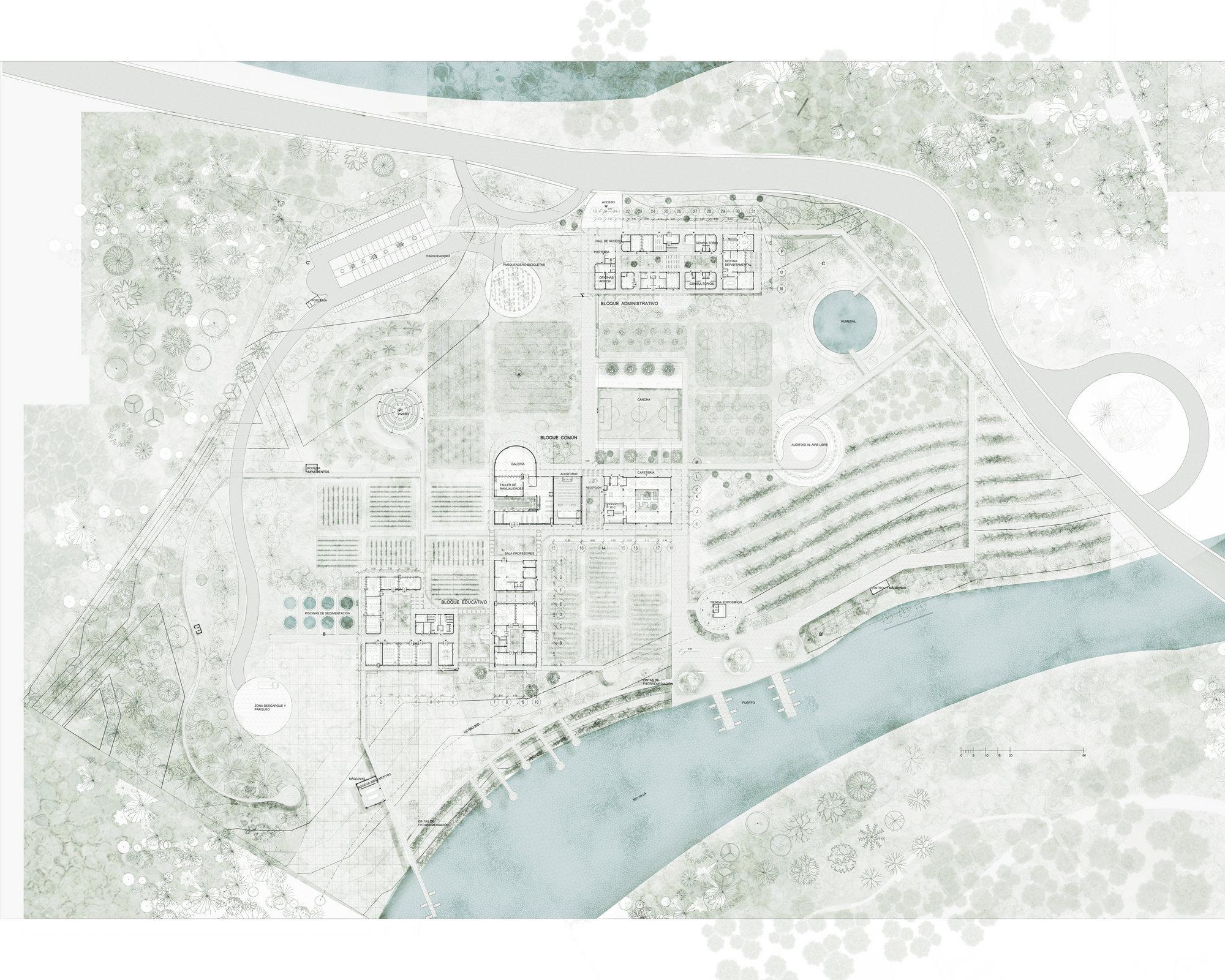 La intervención en la Estación Miraflores, ubicada junto a la Quebrada Santa Elena, incorpora elementos del paisaje circundante, como la quebrada, la montaña, el bosque y la topografía, en el diseño arquitectónico. Se utilizan geometrías como gradas, jardines, cuerpos de agua y escalonamientos para integrar estos elementos naturales en el edificio. La disposición de los espacios seadaptaalatopografíadellugaryseintegraconlaestructuraexistentedela estación, permitiendo que el paisaje se convierta en parte integral del programaarquitectónico.