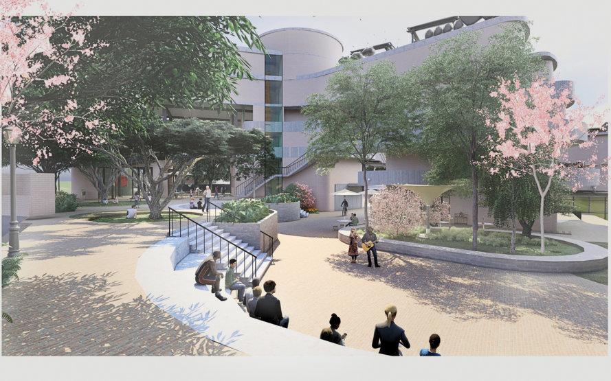 De igual forma se entiende la topografía del fragmento y la pieza como una oportunidad para la generación del espacio público en diferentes niveles con gradas,, escaleras y rampas que generan escenarios al aire libre, dobles niveles en algunos de los volúmenes o restaurantes y divisiones espaciales demarcadas por el nivel.