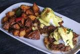Top with sauteed onions, crispy bacon and gravy. To round things out, add a baked potato, butter, sour cream and broccoli salad.