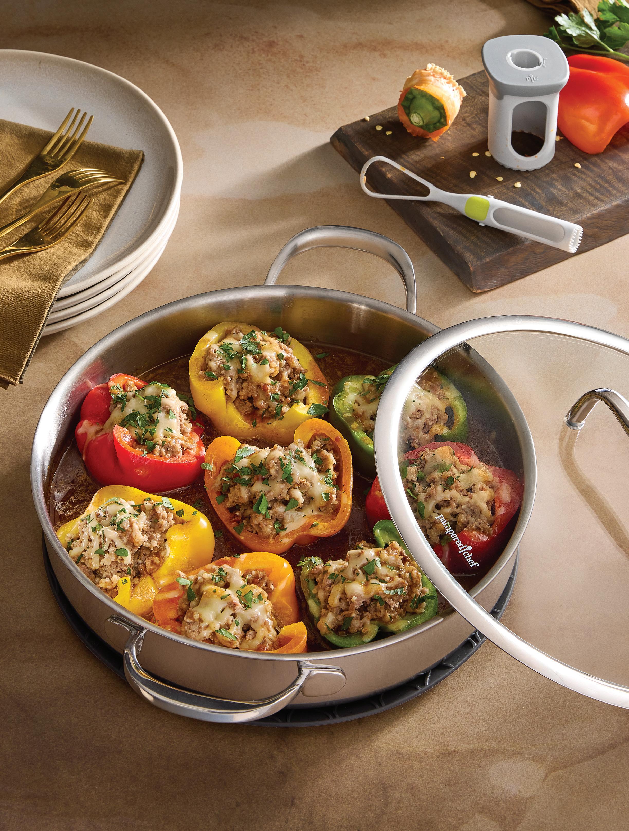This uncoated pan heats evenly, lasts forever, and helps you cook like a pro. It’s perfect for searing, sauteing, simmering, and serving in style.