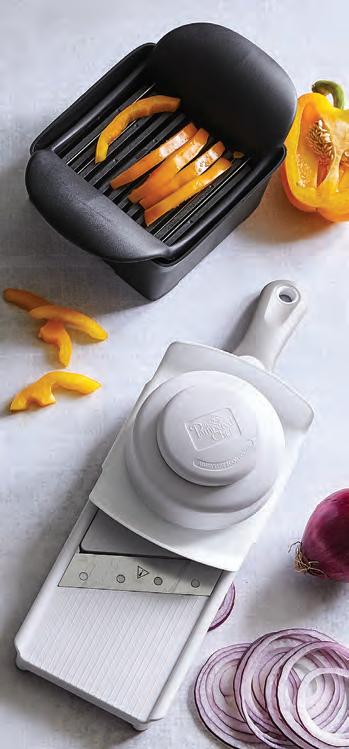 Slide fruits and veggies back and forth for even slices. Use it over a bowl or cutting board. Blade adjusts to 1⁄16" (2 mm), 1⁄8" (3 mm), and 3⁄16" (5 mm). Safety lock keeps blades covered for storage. #1099 $46