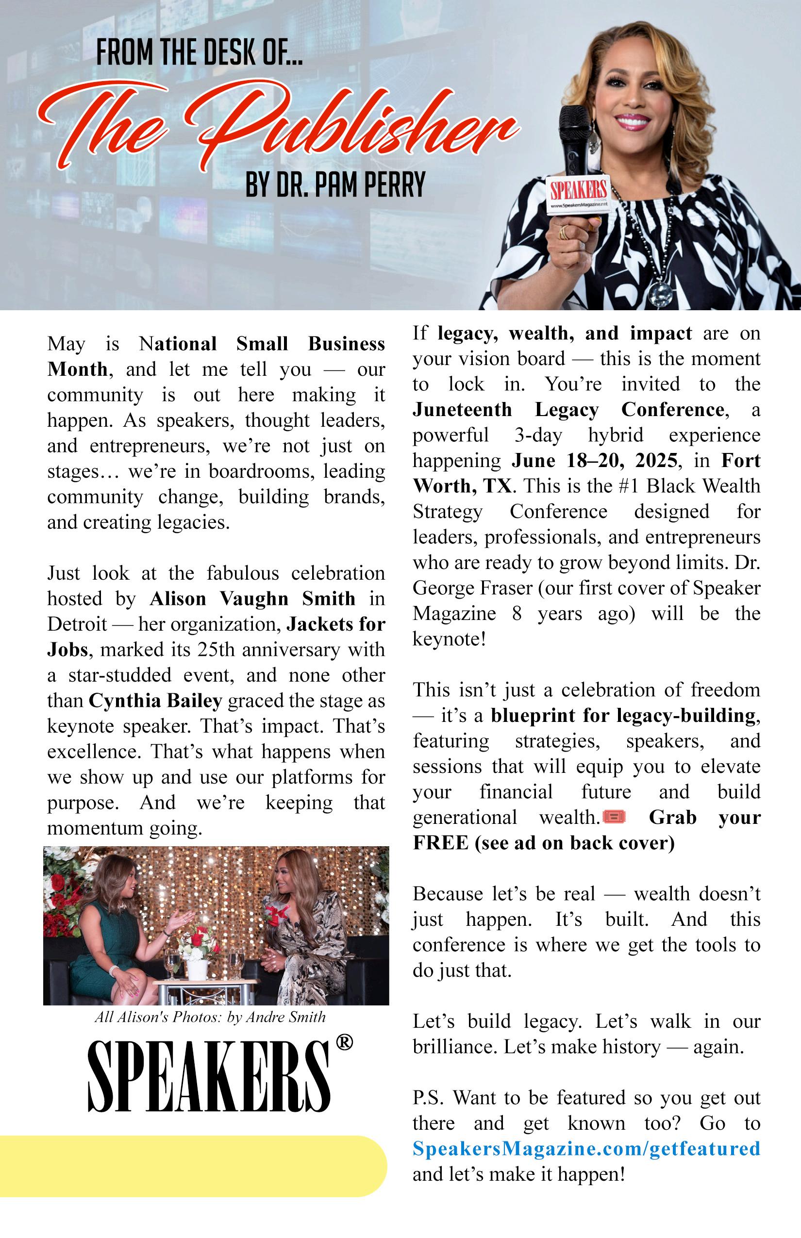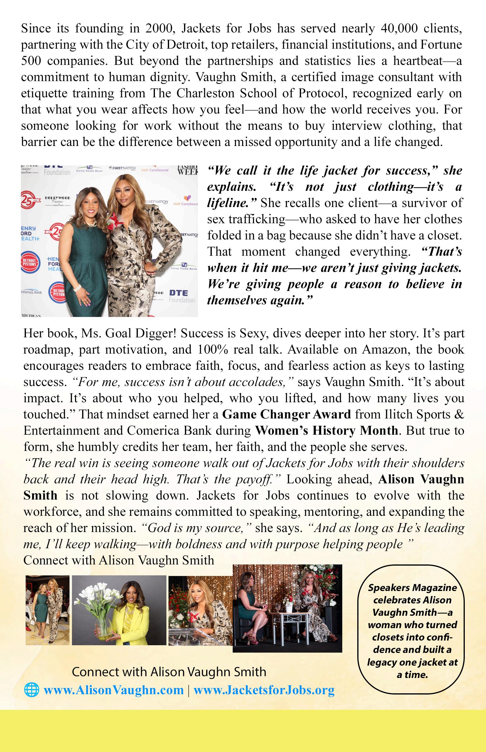 The May 2025 issue of Speakers Magazine shines a spotlight on the power of entrepreneurship, leadership, and legacy-building during National Small Business Month. Gracing the cover is Alison Vaughn Smith, founder of Jackets for Jobs, whose inspiring journey from Detroit entrepreneur to national advocate for workforce empowerment exemplifies resilience and community impact.