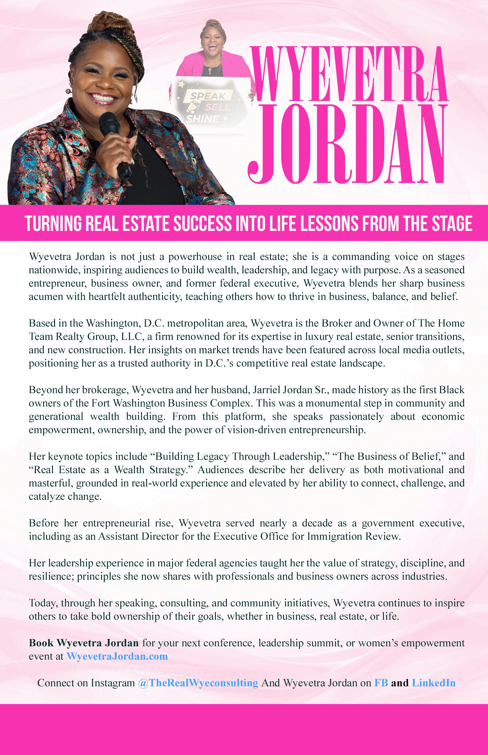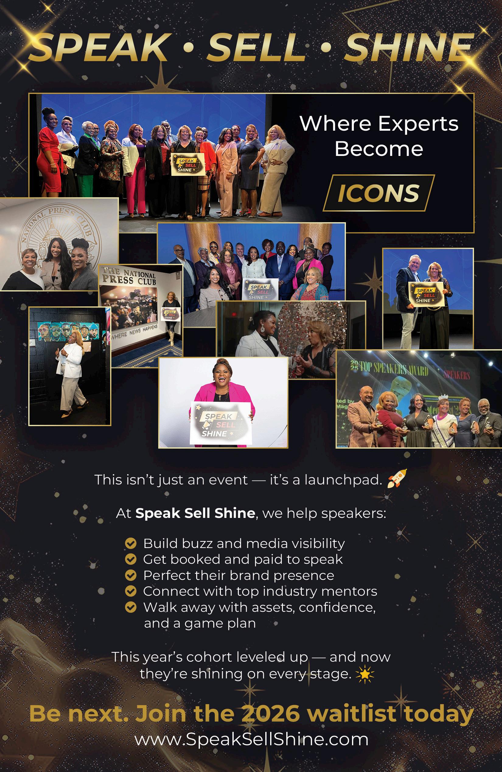 This special Speak Sell Shine debut issue spotlights Senita M. Hill on the cover — a powerhouse speaker, author, and leader helping others rise in purpose, presence, and power. Inside, we highlight dynamic voices from the Speak Sell Shine experience at the National Press Club and Howard Theatre, including the first-ever Top Speakers Award honorees.