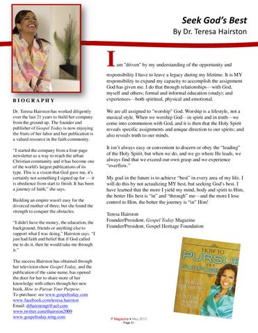 I BIOGRAPHY Dr. Teresa Hairston has worked diligently over the last 21 years to build her company from the ground up. The founder and publisher of Gospel Today is now enjoying the fruits of her labor and her publication is a valued resource in the faith community. “I started the company from a four-page newsletter as a way to reach the urban Christian community and it has become one of the world's largest publications of its type. This is a vision that God gave me, it's certainly not something I signed up for — it is obedience from start to finish. It has been a journey of faith,” she says. Building an empire wasn't easy for the divorced mother of three, but she found the strength to conquer the obstacles. “I didn't have the money, the education, the background, friends or anything else to support what I was doing," Hairston says. “I just had faith and belief that if God called me to do it, then he would take me through it.” The success Hairston has obtained through her television show Gospel Today, and the publication of the same name, has opened the door for her to share more of her knowledge with others through her new book, How to Pursue Your Purpose. To purchase: see www.gospeltoday.com www.facebook.com/teresa.hairston Email: drhairstongt@aol.com www.twitter.com/thairston2009 www.gospeltoday.ning.com