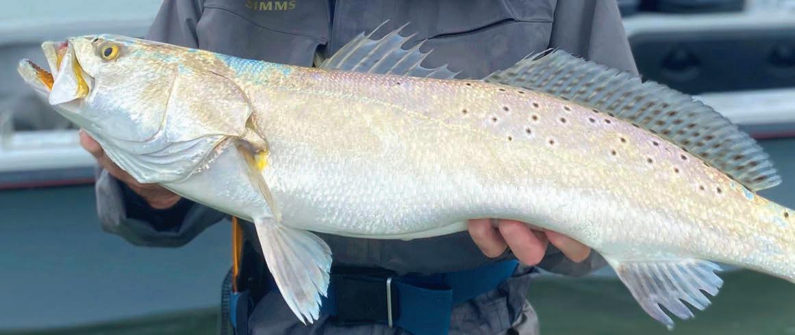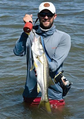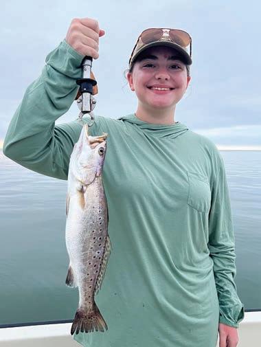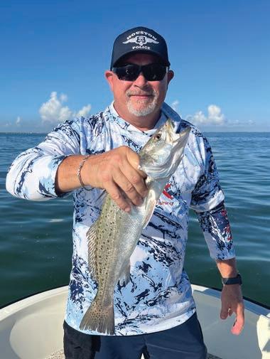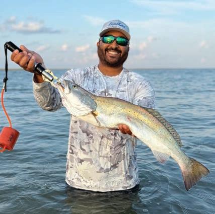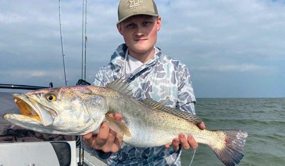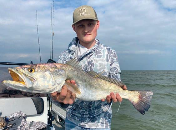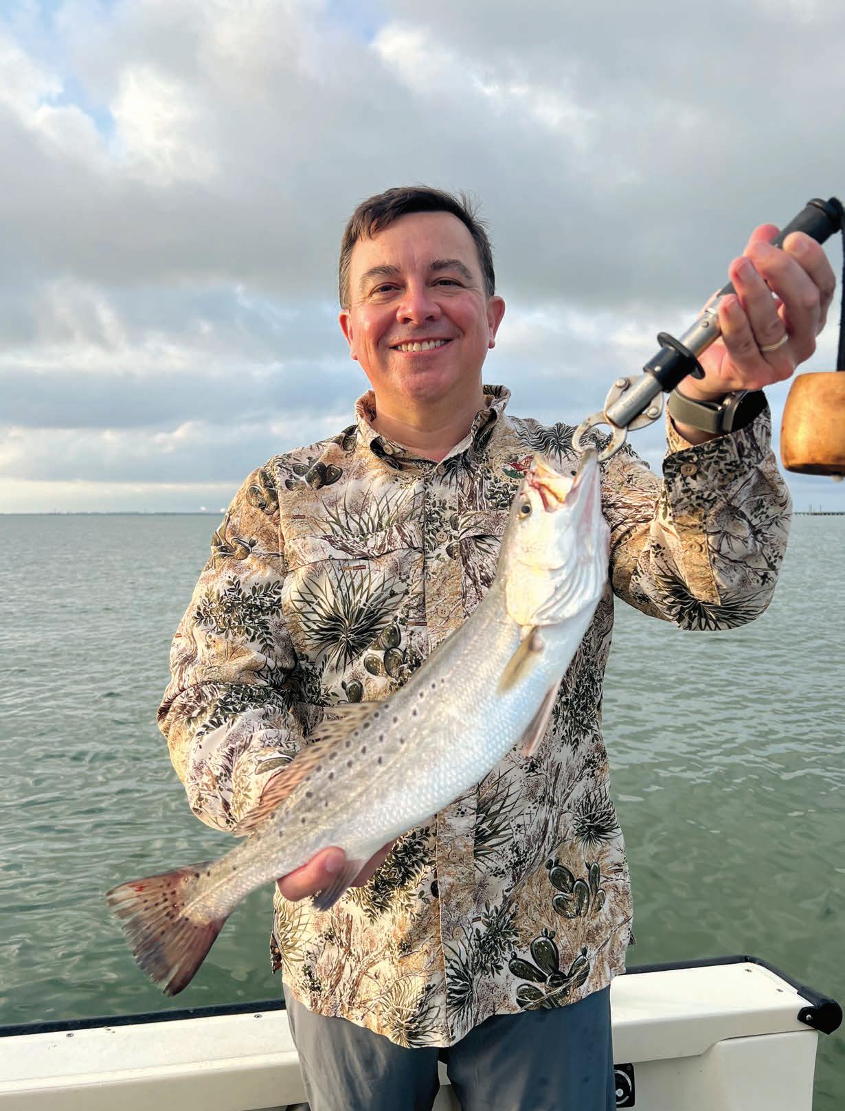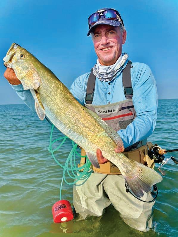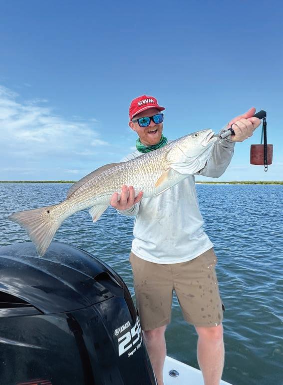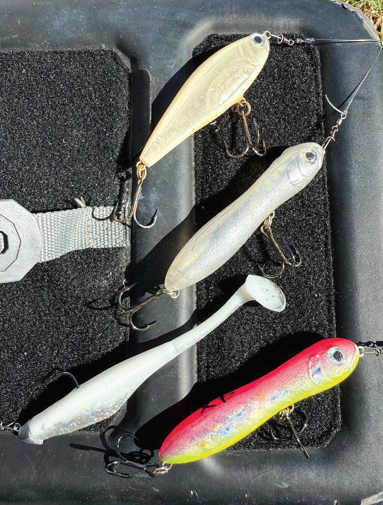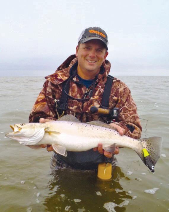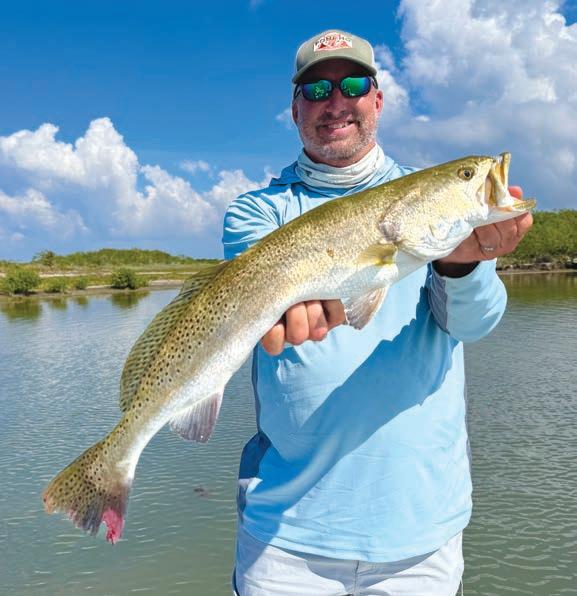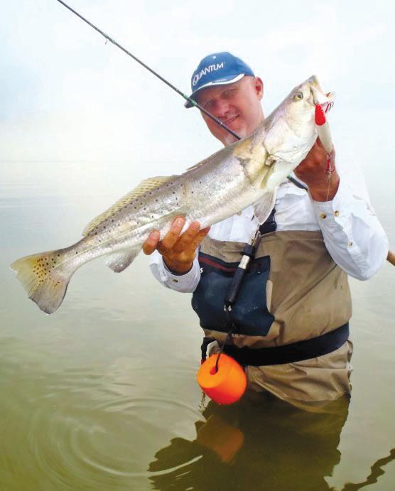 plastics with red and gold hues. “When the weather warms after a strong front, wading in muddy areas close to reefs can be the better option. Then, we switch to slow-sinking twitchbaits and occasionally topwaters to target big trout, often finding more reds than trout.”