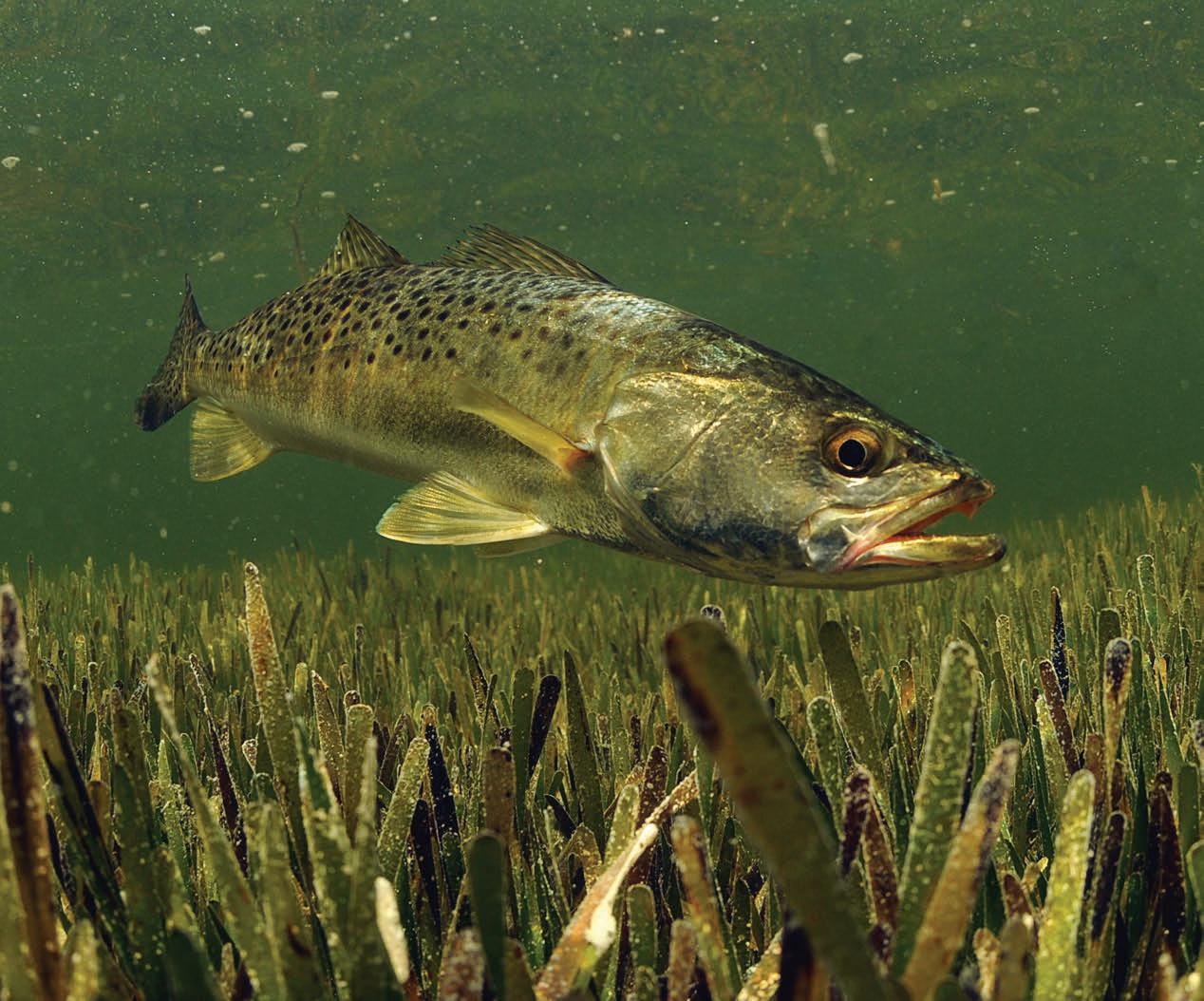 Trout can tolerate a wide range of salinities, but excessive amounts of freshwater can greatly affect their movements. The initial phase of moderate to heavy freshwater inflow occurs when there’s just enough rain to cause the surface to become fresh, pushing trout closer to the bottom where suitable salinity remains. When we’re faced with this scenario, we usually fish the same general area but switch to heavier (eighth- to quarter-ounce) lead heads to work beneath the freshwater layer. Water clarity is typically murky in this situation, so we use darkercolored soft plastics for added contrast.
