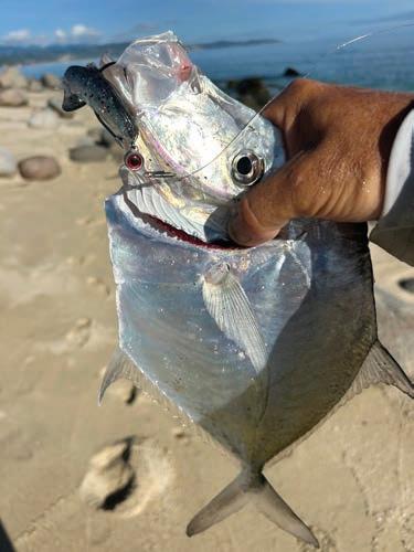 Pompano from the beach on the ZMan swimming jig head and Mulletron soft plastic.