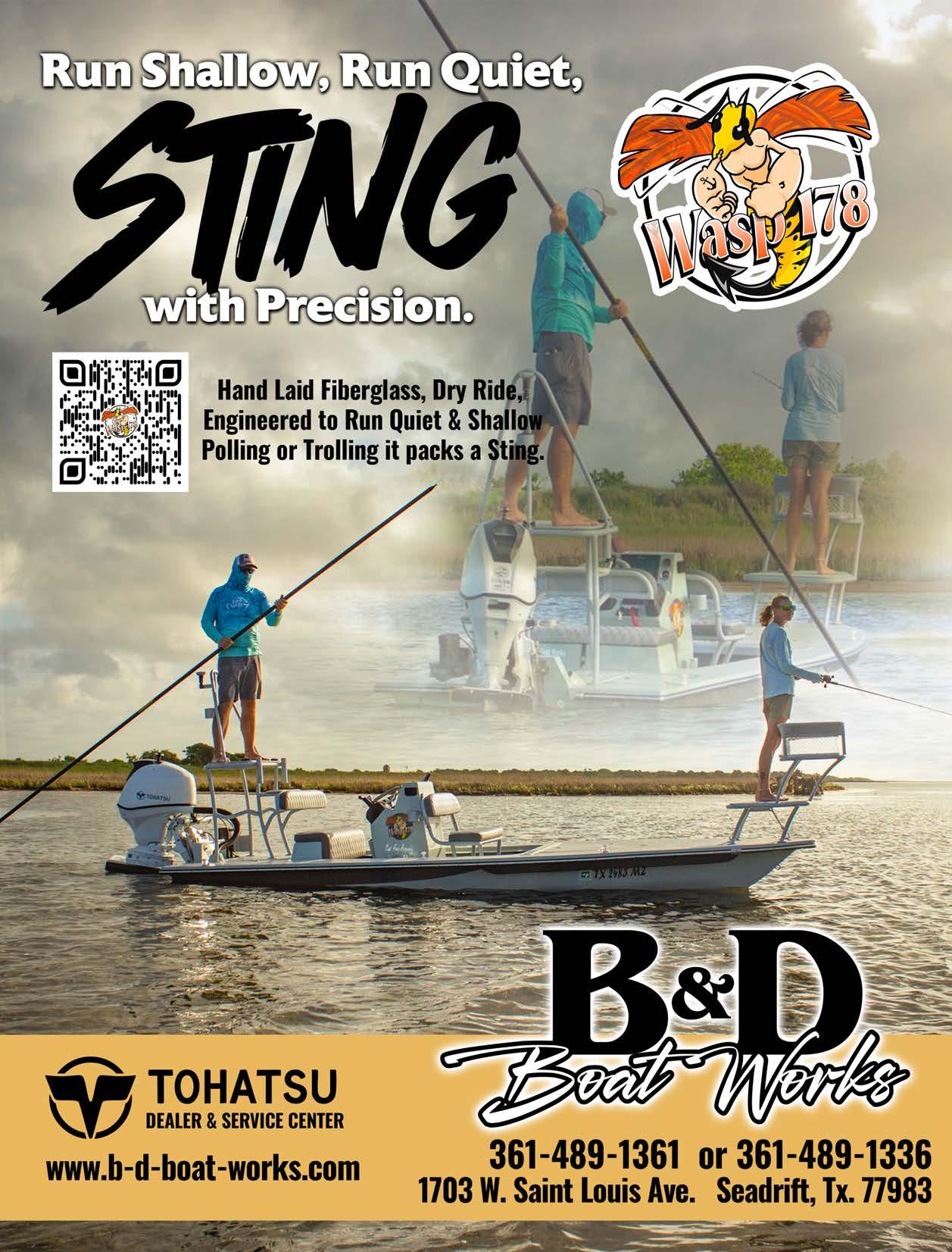“December is one of my favorite months for fishing around Matagorda,” Glenn says. “In early December I’m usually still targeting both trout and redfish under working birds in East Matagorda Bay. I suggest throwing soft plastics rigged on quarter-ounce jigheads— MirrOlure Lil Johns, Hogie’s Major Minnows, and Bass Assassin Sea Shads are favorites. “Gulp! Shrimp or Vudu Shrimp under Coastal Corks also work great, especially for beginners. As December rolls on, the fish transition to feeding mostly on mullet and concentrate more around shell in deeper water. When bird action fades, I key on mullet over shell bottoms in four to six feet of water and throw topwaters and soft-plastic jerkbaits such as Bass Assassins and Coastal Brew Darts. “Provided we don’t have too much runoff, the Colorado River can also be productive. I like to drift the banks and throw paddletails on 3/8-ounce jigheads, looking for stretches with the most shad or mullet.”