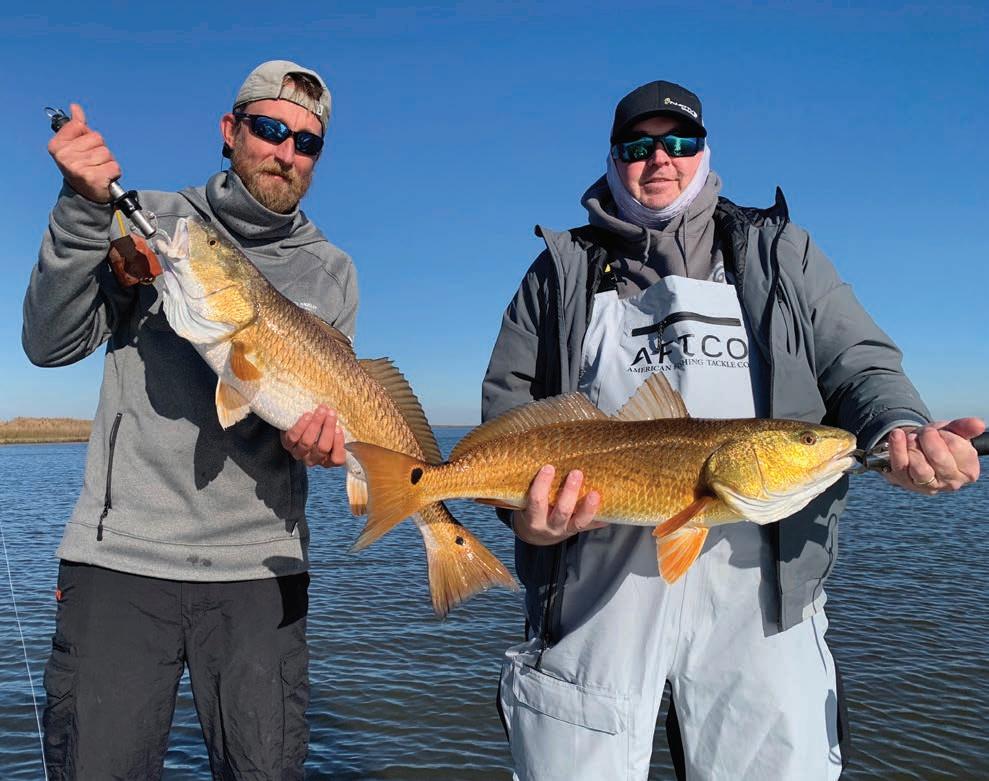 January is a great time for Blake, as his cast and blast season reaches a crescendo. “We spend lots of days hunting ducks, then fishing our way out of the marshes this time of year. There’s some good dove hunting in the afternoons, too. On the fishing front, we usually have plenty of reds and some bigger than average trout in water about thigh-deep in some of the back-lakes. Fishing is pretty good on shorelines with a sandy, grassy bottom in most of the area bays, too. We throw soft plastics a lot this time of year. I use my old standby Norton Sand Eels in dark colors with chartreuse tails, like I do all year, but I throw the pearl/chartreuse Gulp! lures more this time of year. They work better on some of the days when the bite is not really vigorous. On the other hand, I also have some really good sessions with small topwaters during January. I like the Baby Skitter Walks, in colors like gold/ chartreuse and gold/blue. When the weather is warm and the bait is active, we normally have several days this month when we can catch plenty of reds and some of the bigger trout on those little plugs.”
