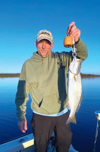 Palacios | Capt. Aaron Wollam www.palaciosguideservice.com - 979.240.8204 So far, the fishing in the Palacios area has been excellent since the weather cooled down. The local rivers have been producing good numbers of trout in the cooler waters. The Colorado, Tres Palacios and Lavaca rivers have all been holding solid keepers ranging up to about twenty inches. We’re catching them best on DSL lures in purple rain and magic grass rigged on three-eighths ounce heads. We’re also catching excellent numbers of fifteen and sixteen-inch trout while fishing these areas, which bodes well for next year. Wading some of the area shorelines has produced decent numbers of trout in the three to five-pound class. They’re biting Fat Boys in pear/chartreuse and pearl/black best. Redfish have been plentiful in the back-lakes. They’re gorging on grass shrimp and small crabs. We’ve been throwing pearl/ chartreuse Norton Bull Minnows and bone Spook Juniors to catch them. Night-fishing on the local piers continues to produce some good catches, with lots of eating-sized sand trout coming to hand, with the occasional keeper spec mixed in. At Pavilion Pier, locals are catching excellent numbers of bull reds and big black drum, soaking crabs and mullet. While water temperatures remain cool, the rivers and deep holes will produce best.