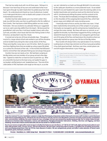 sun set, I elected to run back out through Mitchell’s Cut and across to the cattle pen shoreline as a more protected route. As we exited Mitchell’s Cut and headed into open water the steering cable on my buddy’s boat broke and somehow took out the electrical harness with it, simultaneously killing the power and the controls to the motor. The boat died immediately and began to drift helplessly on the shoulders of the outgoing tide toward the Pass, which had grown angry and riddled with nasty standing waves. I frantically tried to find an anchor, but there was none. It had been inadvertently removed by one of the campers in our group. Eventually we managed to get the wiring harness hooked back up and got the motor started. But there still were no controls, so as I applied the throttle, my friend bear hugged the 90 hp cowling and steered the boat by hand. Somehow we managed to get the boat out of the grips of the Pass and back down the shoreline where we eventually reached our group near the foot of the Big Jetties. Pass Cavallo will always hold a very special place in my memory. Looking back on these trips reminds me of how many personalities it has, both good and bad. And how, over time, certain places can and will engrain themselves in your history.