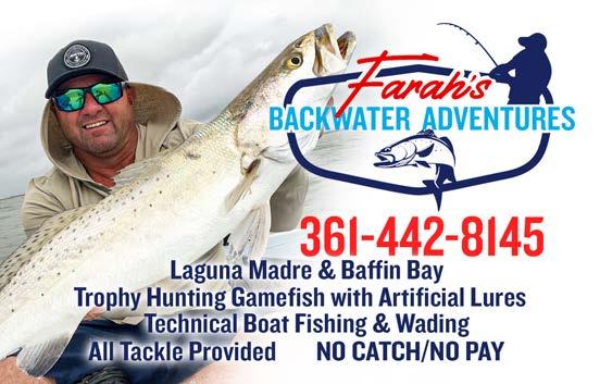 article in this issue. Chuck lives in Orange, TX and fishes Sabine Lake. Interestingly, while the new 3 fish limit has been heralded widely as great move toward boosting trout populations in Texas bays, Chuck has reservations. It’s called the Louisiana Loophole. Texas anglers buy Louisiana fishing licenses and launch from the Louisiana side of Sabine, all for the purpose of retaining Louisiana’s more generous limits. Chuck fears the new Texas limit will encourage more East Texas fishermen than ever to work the Loophole. Time will tell. This comes at a time when Sabine’s trout fishery has only began to recover from a series of unfortunate natural events. A compromise between Texas and Louisiana regulations might provide a solution...if Louisiana would listen.