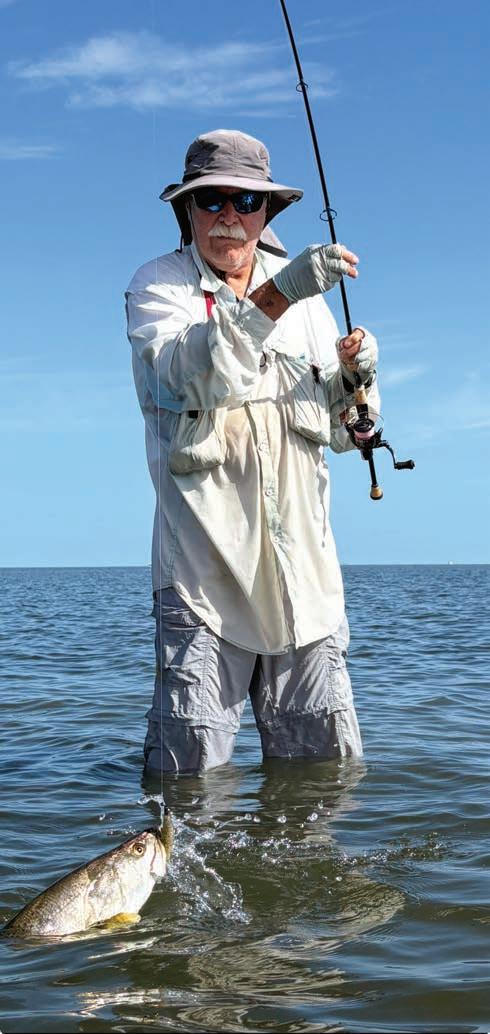 Jim was preparing fields for the upcoming dove season when we talked. “I’m burning some of my fields. Usually, the birds will show up in good numbers after the burn. I’m also looking forward to teal season, but it will likely be somewhat unusual. I probably won’t be flooding fields in parts of the area I hunt, due to some seismic activity being undertaken there. I do have fields to hunt, so people should still call to discuss it. As for the fishing, it’s been great lately, especially when the surf is right. We’ve had some fun days throwing topwaters, catching plenty of trout, with a high percentage of keepers, on topwaters. The fish bite best in the morning in the shallowest part of the surf zone. I have to tell my guys not to wade out, basically. It’s counterproductive. The fish are so close to the beach it’s better to stay in water no more than shin deep and cast toward the first bar. On lots of mornings, most of the fish bite in the little breakers right at the edge of the bar. The action typically lasts until about mid-morning, when the fish move into the deeper water.”