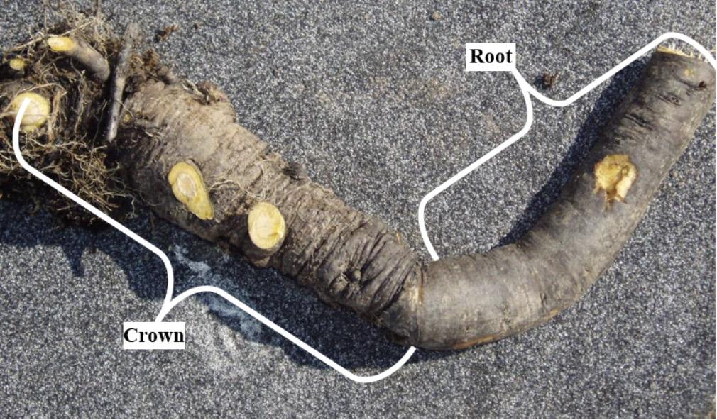 The key to effective physical control of docks is that they can only regenerate from the crown (true shoot), not the true roots as discussed in Section 2.1. Typically, the crown only extends five centimetres below the soil surface, and rarely as deep as 10 cm, therefore as long as the crown is removed the root will eventually die. However, the ability of the crown to regenerate by producing new roots and shoots is prodigious, so the dug up crown must be prevented from re-establishing. In hot dry weather, especially if there is a good thickness of pasture to keep the crowns from having direct contact with the soil, they can just be left on the field to desiccate and die. In less than ideal drying conditions, the crowns may need to be taken off the field and destroyed, e.g., through composting or putting into slurry pits. The main tool for digging the crowns up is the ‘dock fork’ (Figure 5) which consists of two prongs and a pivot point to ensure a vertical clean lift and ease of use / good ergonomics.