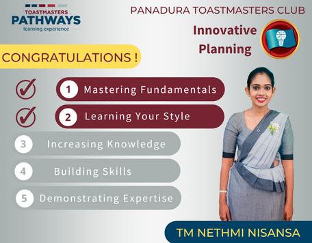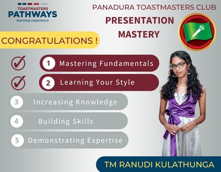 Inmyhumbleopinion,beingamemberofthePanaduraToastmastersClubhasbeen highlybeneficialformypersonalandprofessionalgrowthIthinkitwillhelpmeto improvemypublicspeakingskills,selfconfidence,leadershipqualitiesandabilities of better communication. There is a nice, comfortable, joyful and encouraging environment in PTM family. I highly appreciate and I must express my sincere gratitude to all the members of Panadura Toastmasters Club for feel me fully welcomeonmyfirstday.Theysupporttomewithalloftheirhearts. SoIwillhopetostartmytoastmasterjourneywiththisamazingclub.Iamproudof myselfforbeingapartofthiswonderfulcommunity Ithinkitisnotonlyaclub,butalsoitisanicefamily.