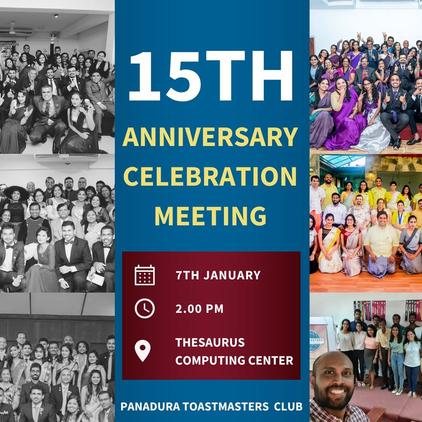Each New Year begins with a celebration. Therefore, it’s the sameforourPanaduraToastmastersfamily.ButIt’snotjust becauseofthenewyear;Intheveryfirstmeetingoftheyear 2023, we celebrated our 15th anniversary as a club too. So, on that day the meeting theme was 15th anniversary of the Panaduratoastmastersclub.Asalways,everyone’sfavourite ourmadampresidentJithmistartedthemeetingwithsome interesting facts about Toastmasters history by inviting to toastmasterofthedaytocontinuethemeeting.Forour15th anniversary-themedmeetingthetoastmasterofthedaywas ourimmediatepastpresidentTMMihikala.Asalways,shedid a wonderful job throughout the meeting becoming the best role player of the day too The 1st warm up session of the meeting,roundrobinsessiondonebyme,anditwasabout “the best thing that we learned so far in our Panadura Toastmasters journey”. I think from that session we got a chancetoknowaboutoneanother’slessonthattheylearnt in their Toastmasters journey. After round robin session withoutanydoubts,ourTMSeraanandTMNethmidelivered an amazing speech adding more meaning to our 15thanniversarythememeeting TableTopicsessionwasdoneby our talented TM Amasha and as always she conducted a really interesting session by encouraging our audience to participateinspeechesbygivingchocolatesasagiftfortheir participation As a result, our toastmasters did their table topicspeecheswithaddingmorecolourtothemeeting.Not only that as in every meeting there was a successful evaluation session done by our TM Jithmi and our TM Pamesha for the prepared speeches while TM Shehani and TM Praneeth evaluated table topic speeches. After an amazinglyfuntime,itwastimeforthetimer’sreportdoneby TMMalindu,ForAhCounter’sreportdonebyTMParamiand TM Kavisha Batawala reported her grammarian report. All those role players make our 15th anniversary-themed meeting more successful with their great efforts. So, in end TM Disara as the general evaluator did a fruitful session which helps to make our club meeting more successful. Finally,themeetingendedwithgivingcontrolofthemeeting back to our club president from our toastmaster of the day TM Mihikala while giving the meeting awards for the best speaker, the best role player, best tag role player , best evaluatorandforthebesttabletopicspeakertoo.