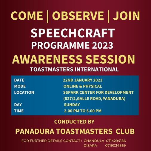 Meanwhile,theclubwasspreadingawarenessaboutthe4th Speechcrafter Programme of Panadura Toastmasters Club. On the exact same day afternoon, Panadura Toastmasters deployed their Speechcraft Awareness session. And it was successfully done in a hybrid manner supplying the benefit fortheoverseasspeechcraftersaswell.Andthenatthelast weekendon29thofJanuarytheyinitiatedtheirSpeechcraft Programmeofficiallyontheonlineplatformanditwasdone successfully.AndonthatdaytheEducationalSessionwhich was about the “Value of Public Speaking” was done by a ChampionspeakerofDistrict82,TMRavinduAmendra. And within the month of February, they did their 2nd Speechcraftprogrammeon5thofFebruarybyinitiatingthe toastmaster duties for the month. It was another successful meeting, and the special educational session was done by anotherprominentspeaker,DTMModithaSendanayakeand it was about “Selecting a topic and organizing the speech” Most importantly, the club officers invited the Toastmasters for the educational session as it was another important educationalsessionineveryspeechcraftmeeting.