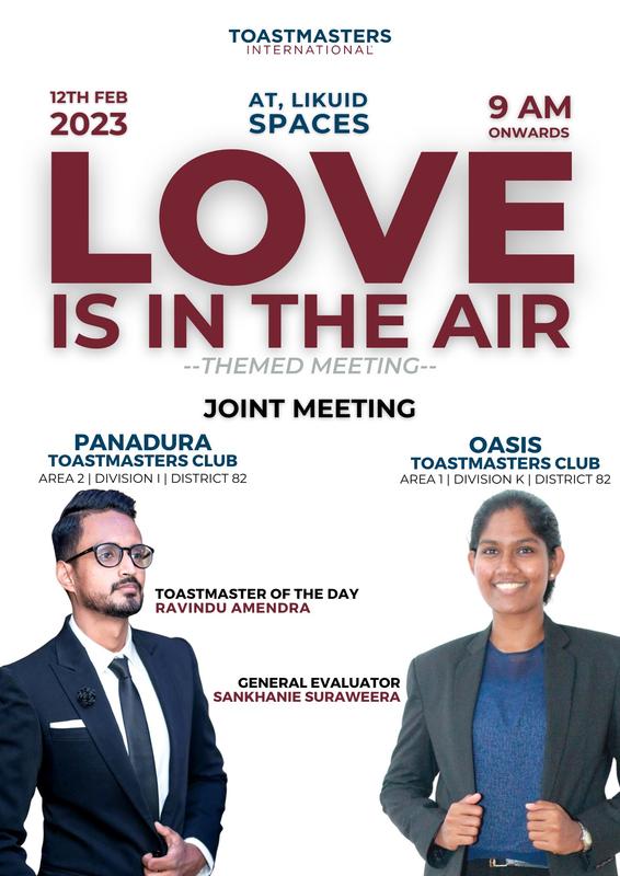 And then on the 12th of February 2023, Panadura ToastmastershadtheirValentine’sthememeetingasajoint meetingwithOasisToastmastersClubasOasisToastmasters visited Panadura Toastmasters at Likuid Spaces, Colombo 5 from900amto1100am