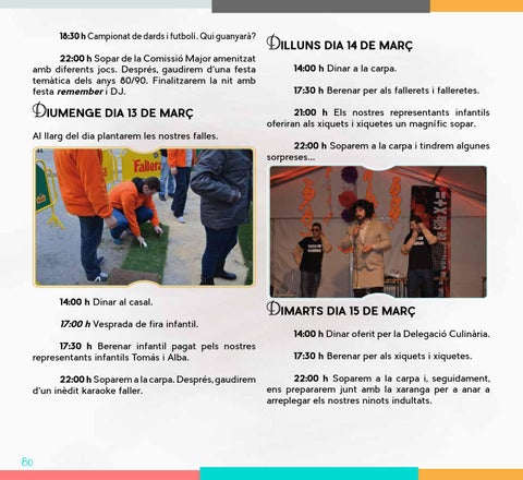 22:00 h Sopar de la Comissió Major amenitzat amb diferents jocs. Després, gaudirem d’una festa temàtica dels anys 80/90. Finalitzarem la nit amb festa remember i DJ.