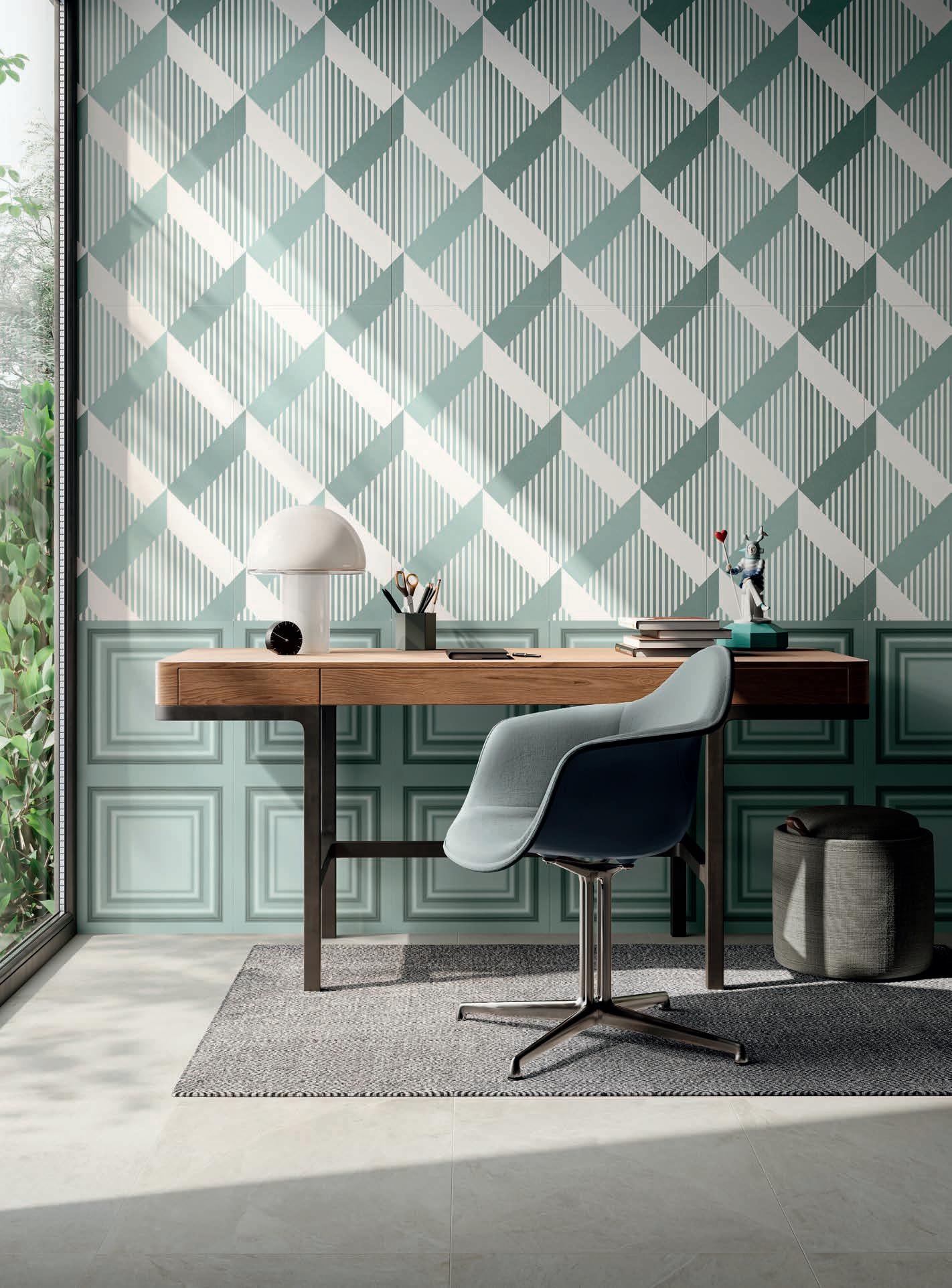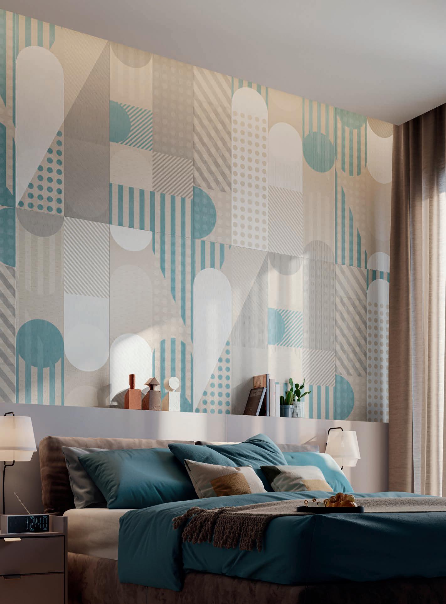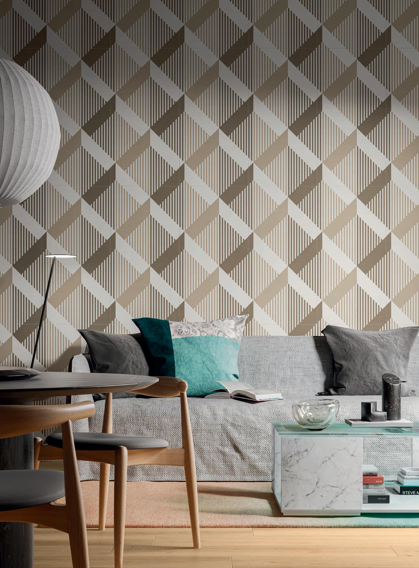 Exquisite textures inspired by traditional textiles unravel rhythmically on the surface with calibrated shades, varied and rhythmic shapes, using a new interpretation of classic elements, such as boiserie wood paneling. This is how I visualized Glam's Geometric Mood designs, a modern reinterpretation of ancient features that are brought harmoniously into the present, a pleasing combination of aesthetics and functionality.
