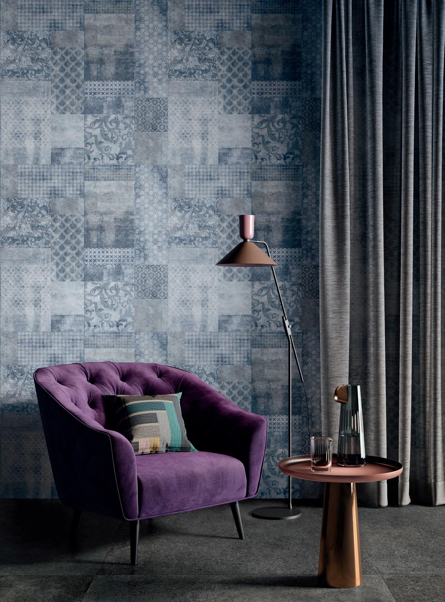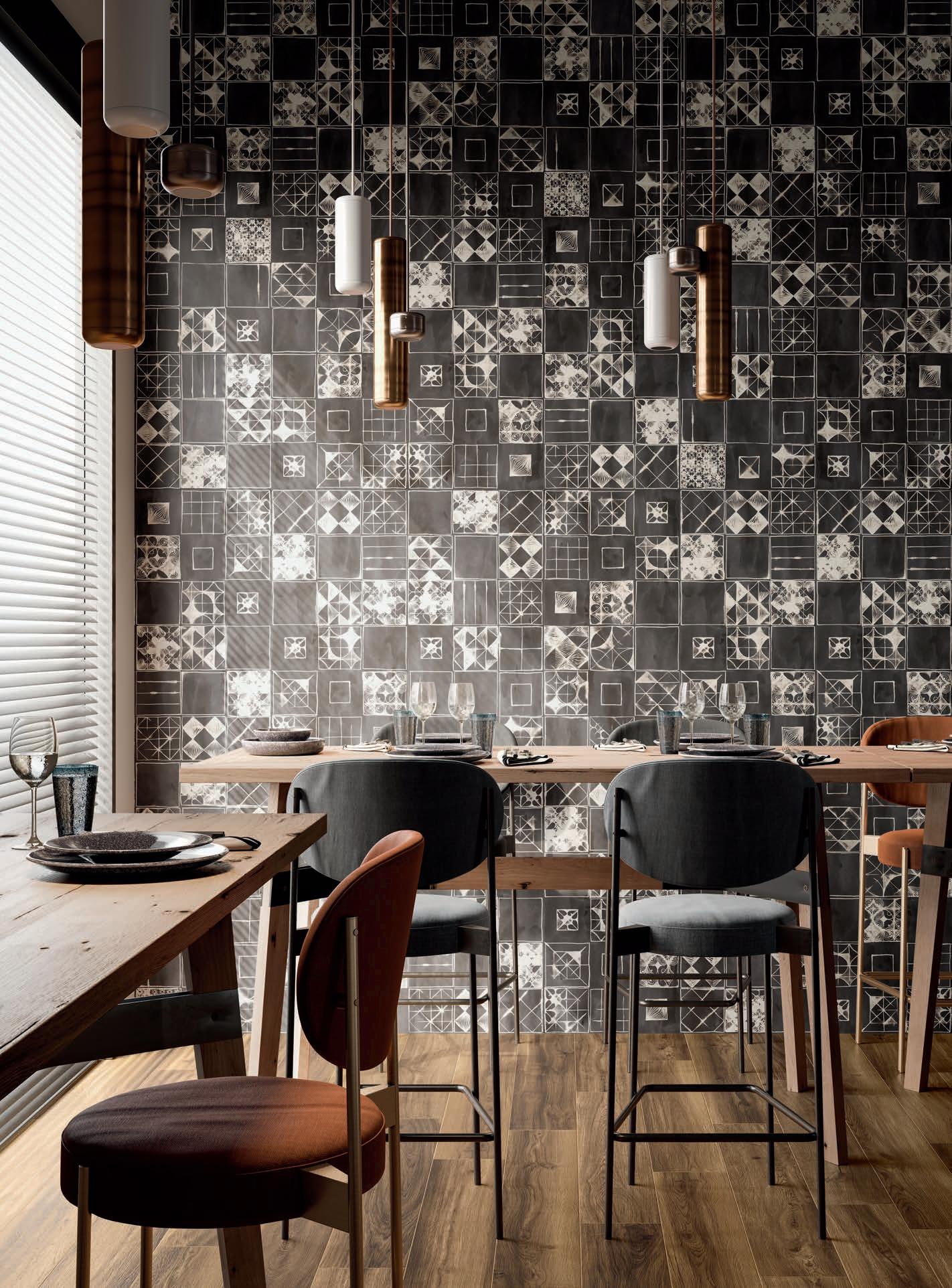 Così si sviluppa il tema Materic Mood, un mix intenso di motivi geometrici che affiorano dalla superficie di lastre ceramiche decorate in profondità con effetti brillanti e opachi, capaci di riempire ed arredare in modo originale, pensati per chi vuole sorprendersi ad ogni sguardo.