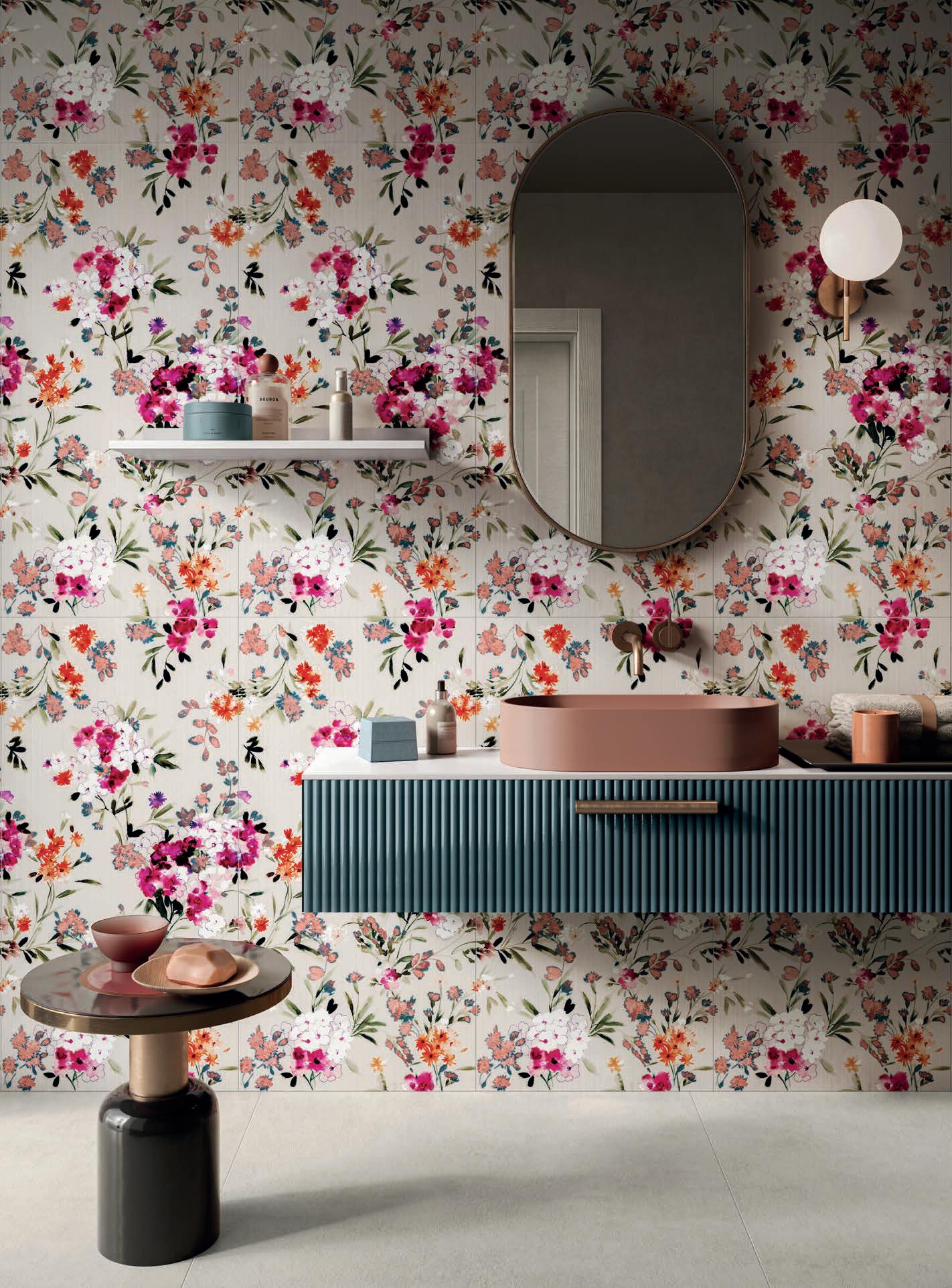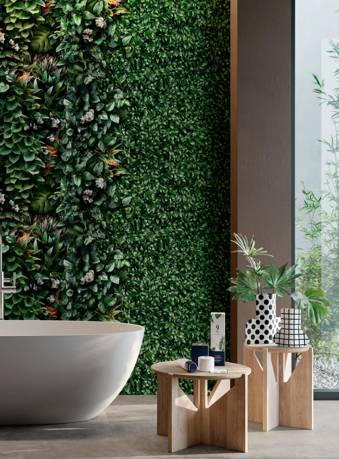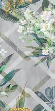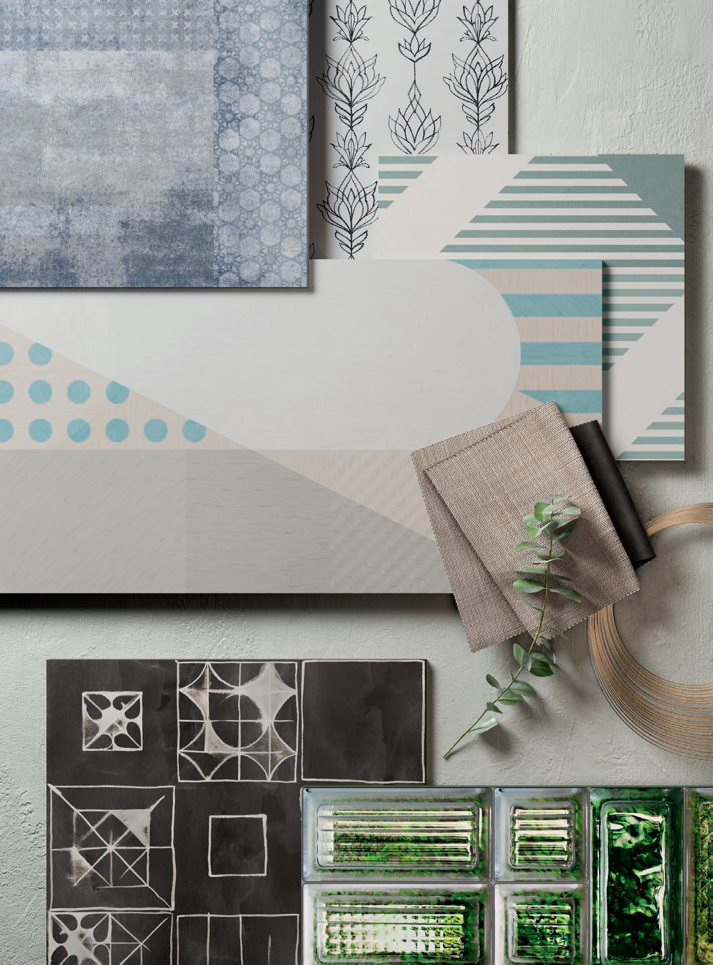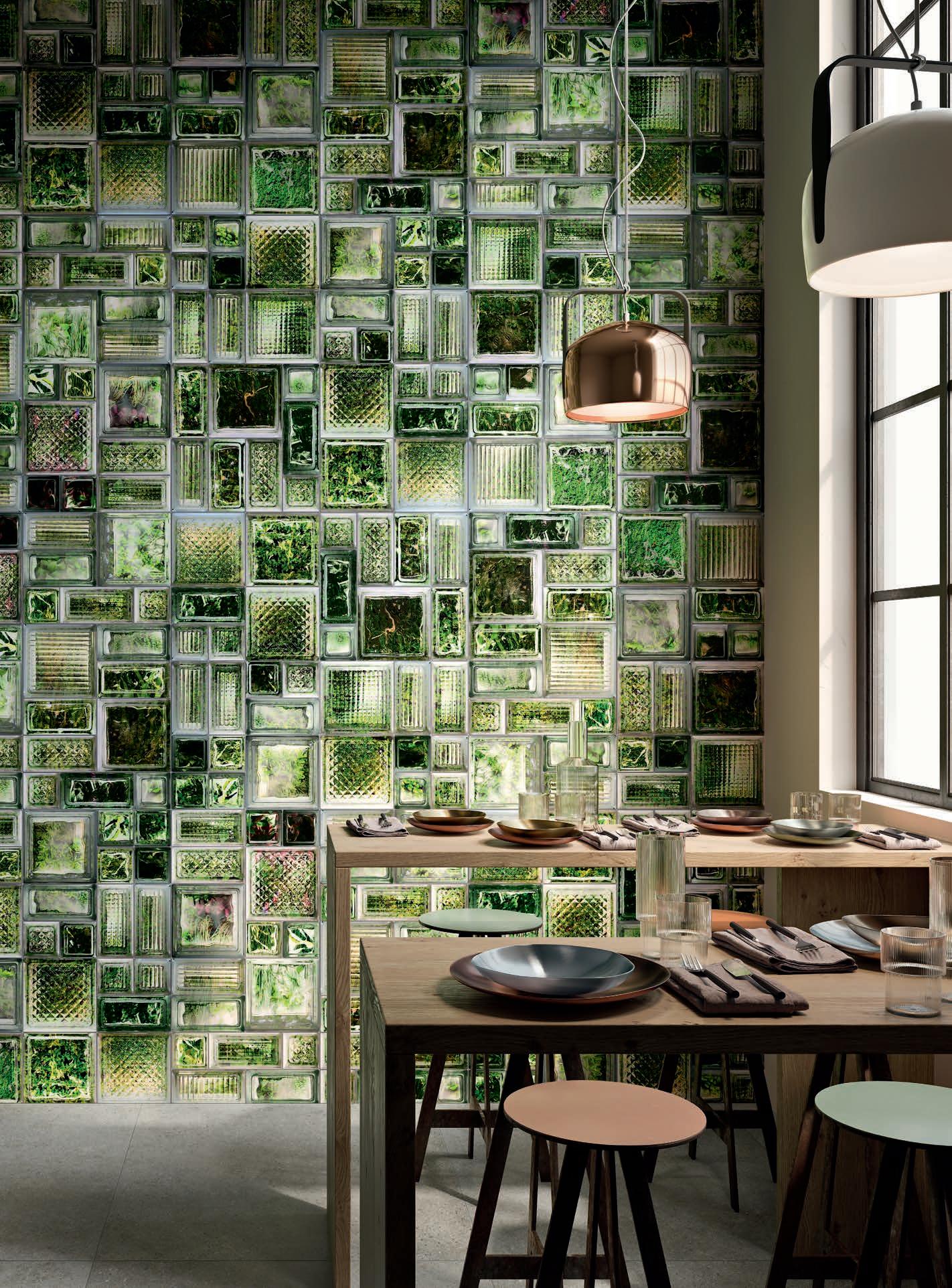 Glass and cement, important materials softened with "handmade" style of graphics that recall the traditional cementine tiles, or the individual effects typical of transparent glass bricks enriched with delicate green leaves.