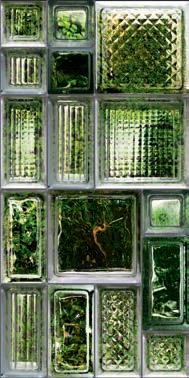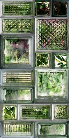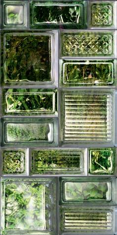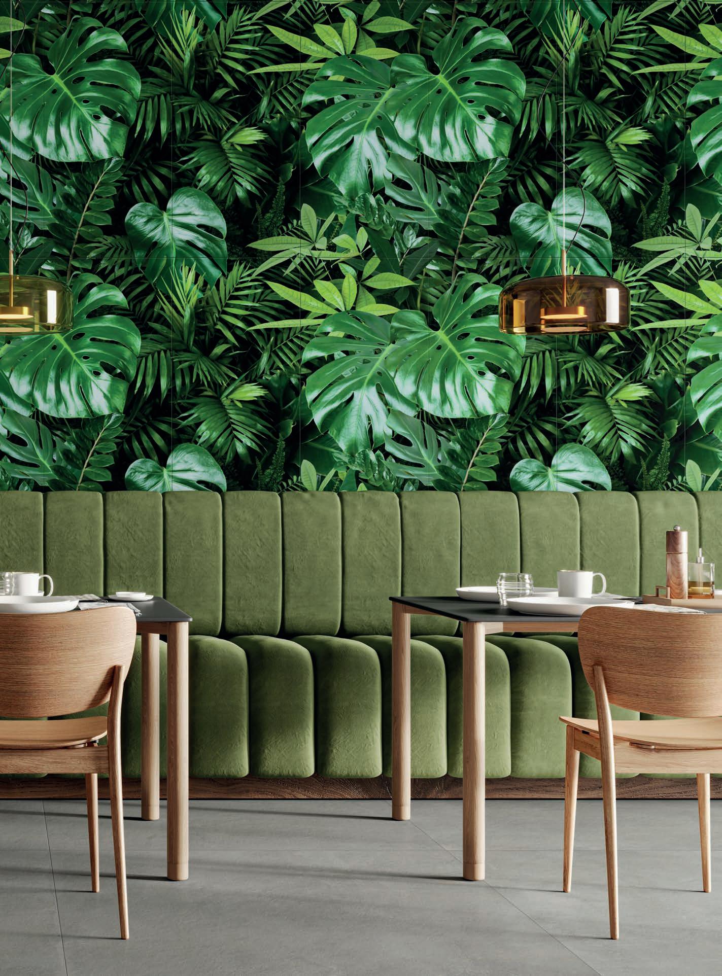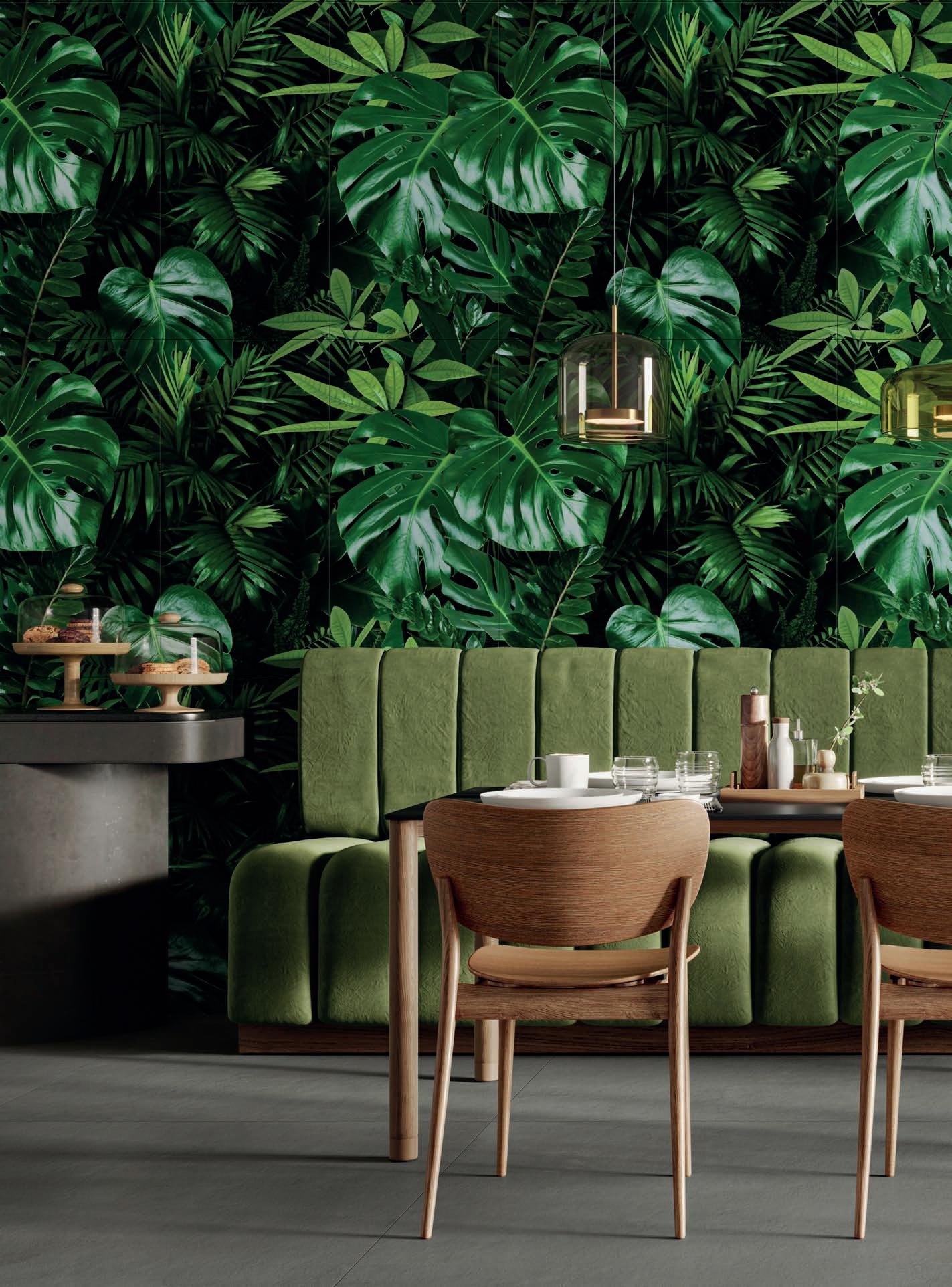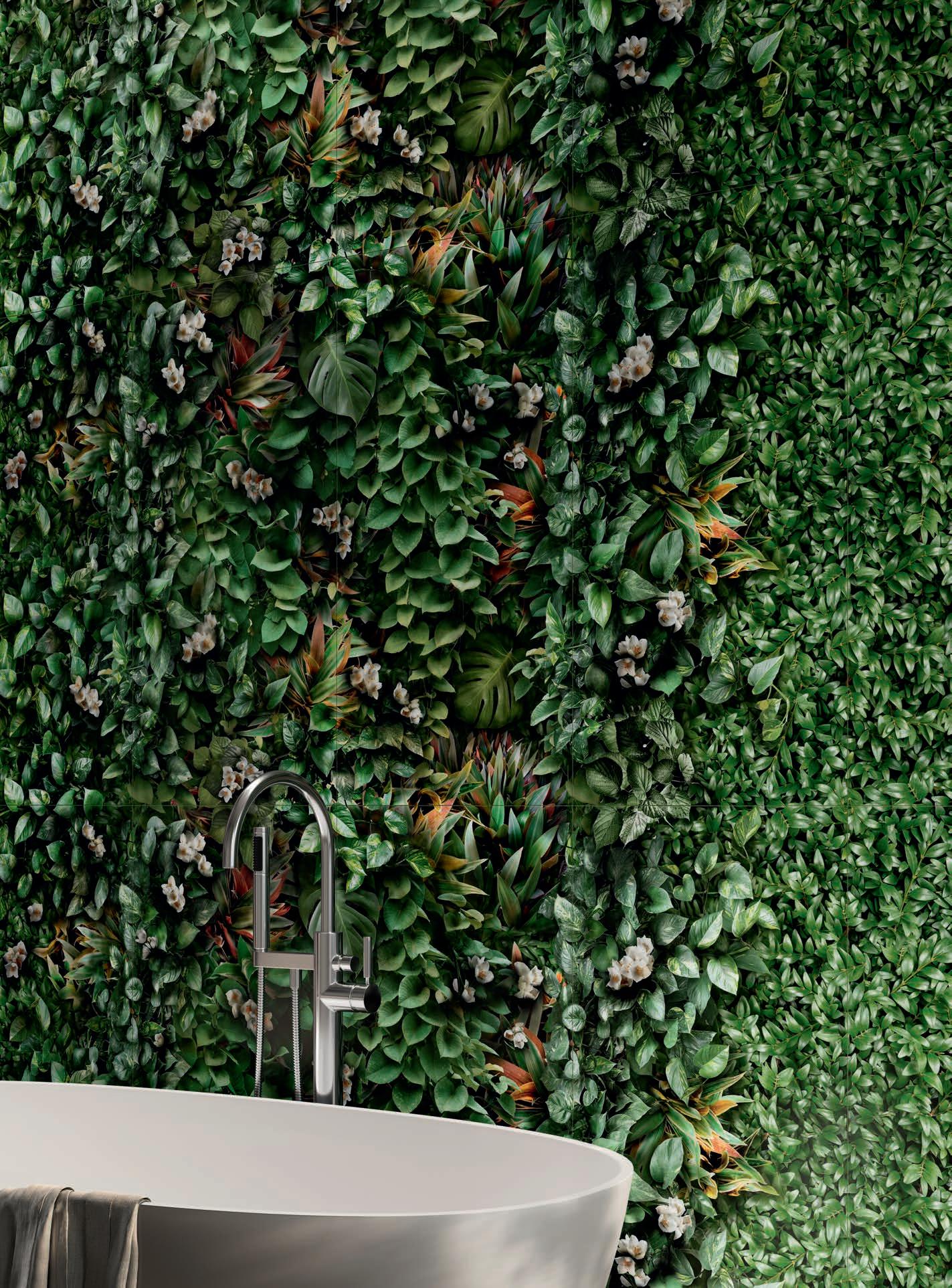 Glass and cement, important materials softened with "handmade" style of graphics that recall the traditional cementine tiles, or the individual effects typical of transparent glass bricks enriched with delicate green leaves.