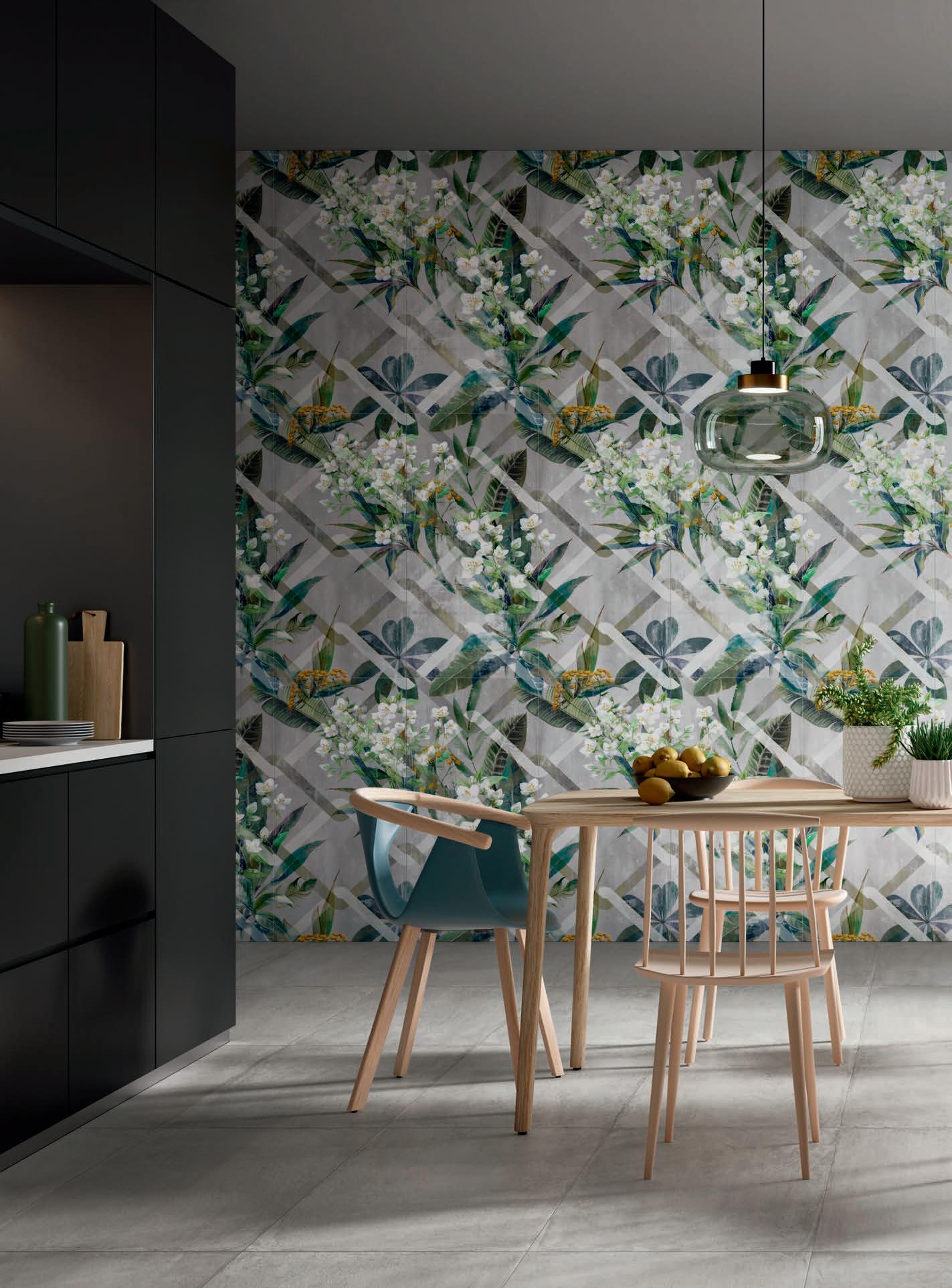 Vetro e cemento, materie importanti addolcite da grafismi in stile "handmade" che riprendono le tradizionali cementine, o effetti variegati tipici dei mattoni in vetro trasparente arricchiti da delicate foglie verdi.