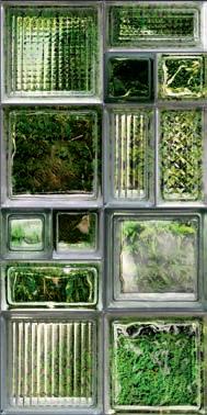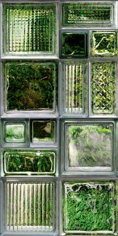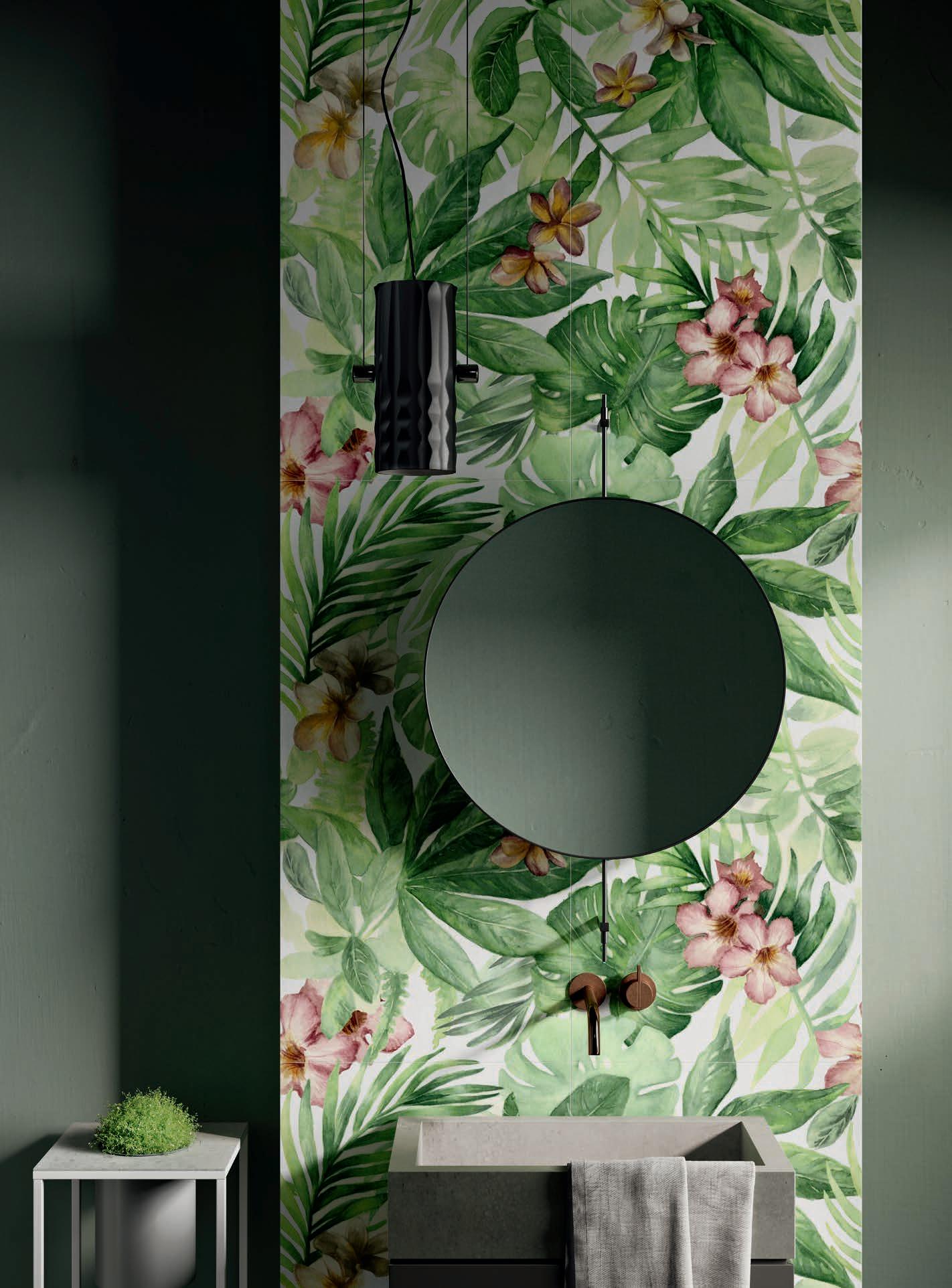 Glass and cement, important materials softened with "handmade" style of graphics that recall the traditional cementine tiles, or the individual effects typical of transparent glass bricks enriched with delicate green leaves.